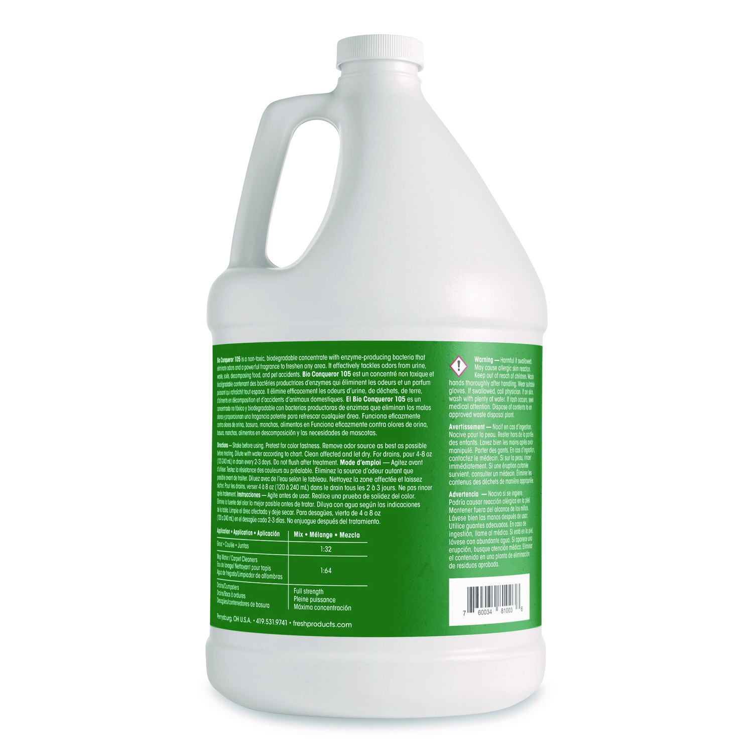 Bio Conqueror 105, the ultimate liquid concentrate formulated to clean and consume odor at the source for long-lasting freshness. Designed to seep deep into the smelliest of spaces, the Bio Conqueror 105 removes odors wherever they linger and consumes urine, waste, food, grease, pet messes, and more for a superior clean that doesn’t just mask odors. Scent: Mango; Physical Form: Liquid; Application: Odor Control; Volume Capacity: 1 gal.