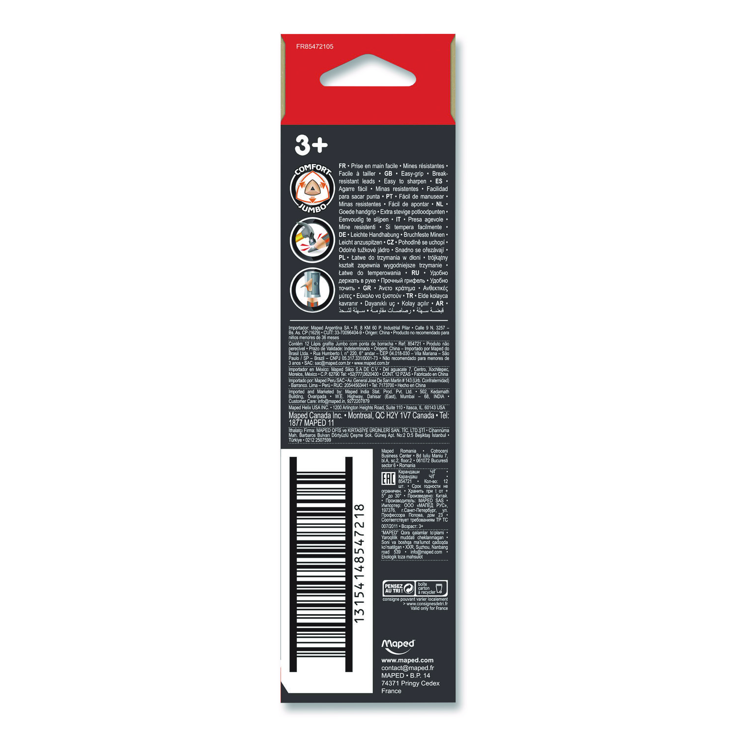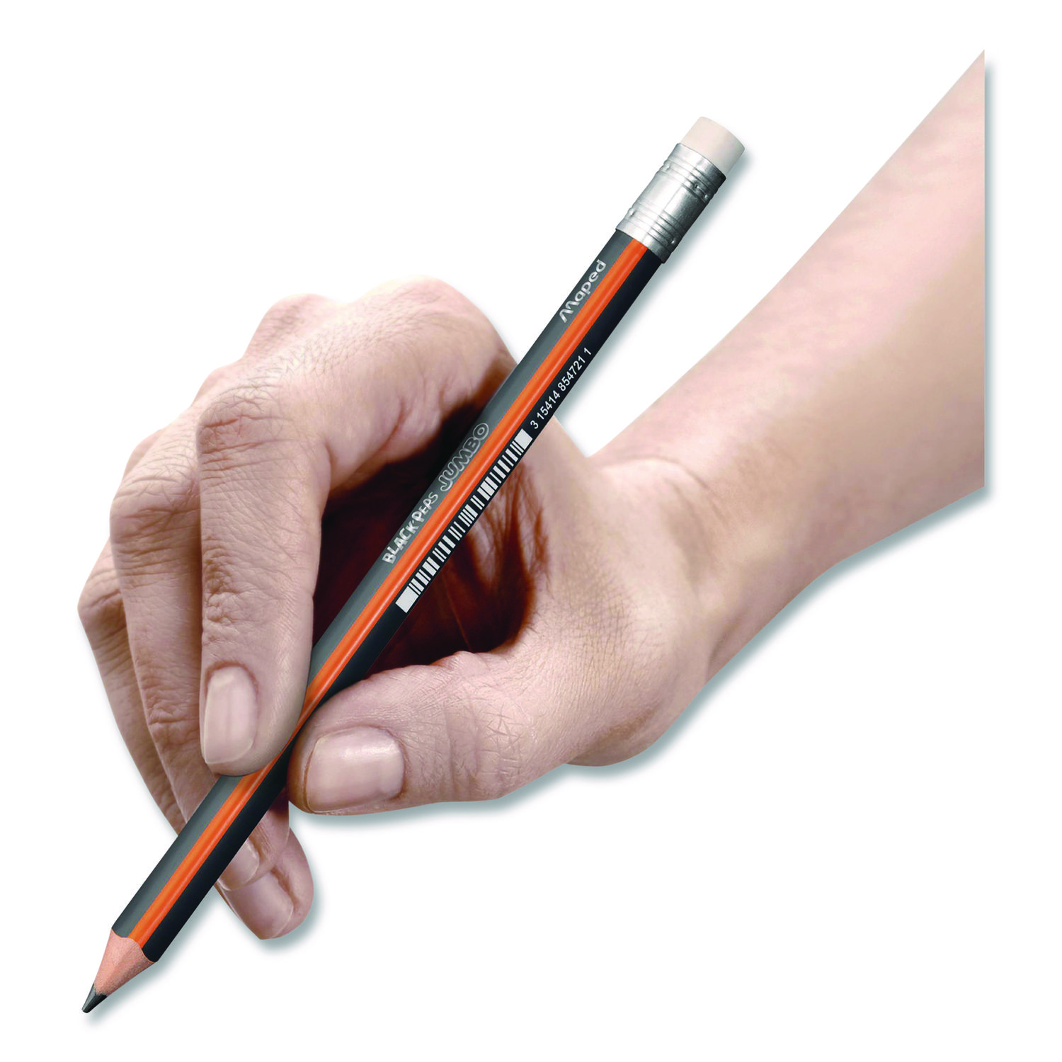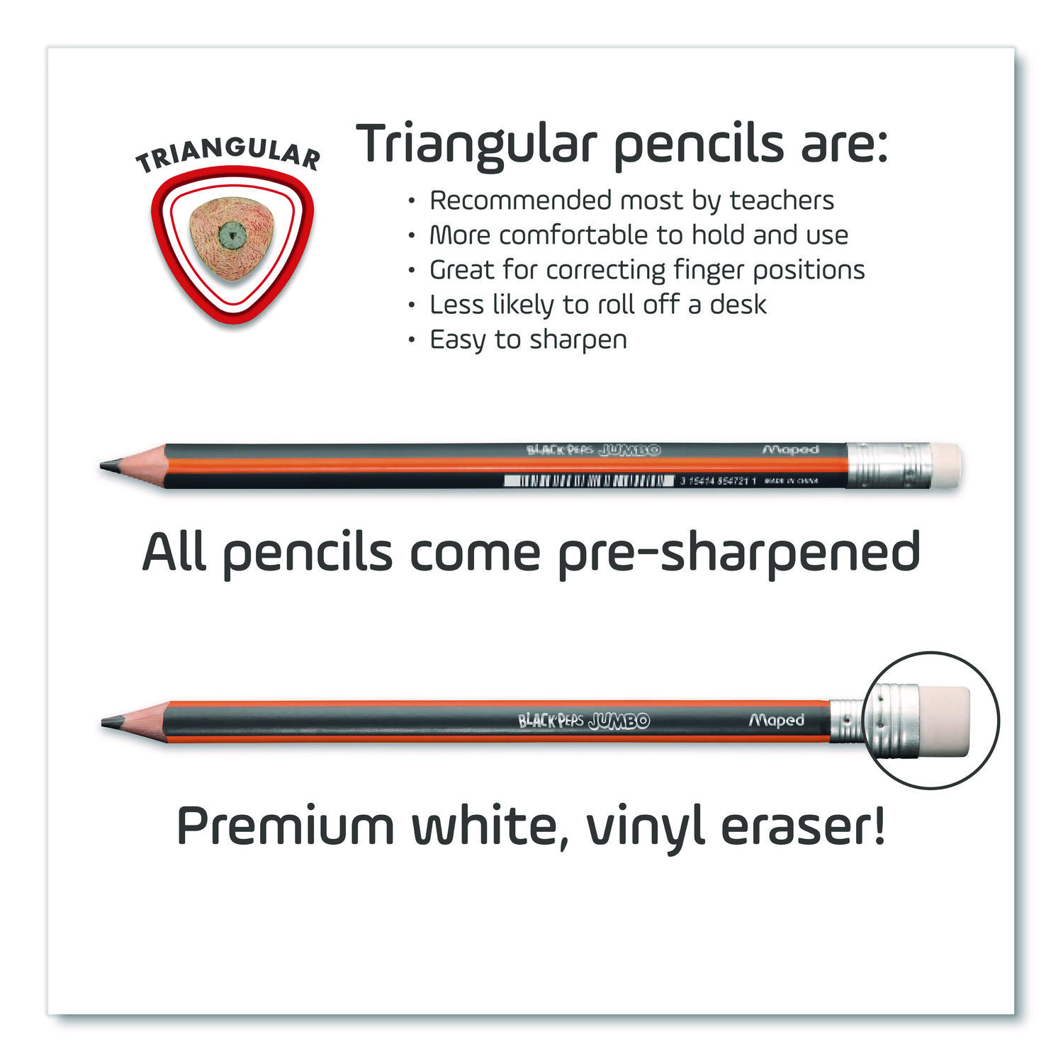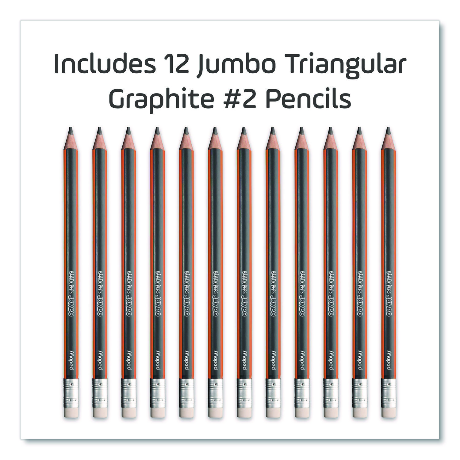 Unlike a standard hexagonal pencil, the oversized triangular body of the Jumbo Black’Peps Triangular Pencils are great for young or older hands and naturally index your fingers in the correct spots for a more comfortable hold! Triangular design also will not roll off the table like a classic pencil and still easily sharpen in any standard two-hole sharpener. High quality graphite is break resistant and fully bonded to the wood casing so it sharpens and writes cleanly with no splinters or separated lead. And the matte finish on the pencil makes it easy to grip and hold so you can use the premium latex-, PVC- and phthalate-free eraser to cleanly removes graphite without smearing or tearing. The Jumbo Black’Peps graphite pencils are the perfect tool for writing, drawing, doodling and more! Graphite Color(s): Black; Color Family: Black; Graphite Diameter: 1 mm; Numeric Graphite Scale: #2.