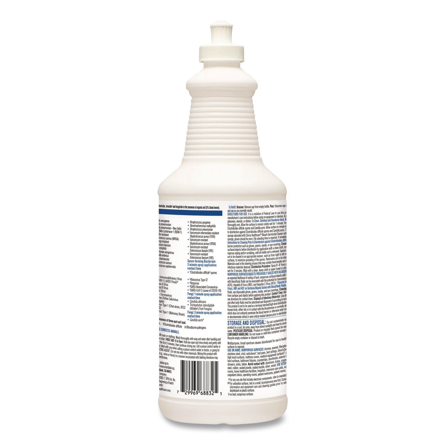 Your proven bleach solution for cleaning. Clorox Healthcare® Bleach Germicidal Cleaner kills C. difficile and C. auris in three minutes and over 50 other microorganisms in one minute or less, including outbreak causing viruses, emerging viral pathogens, MRSA and VRE when used as directed. Compatible with common healthcare surfaces including plastics and stainless steel, this versatile hospital cleaner is even recommended in medical equipment cleaning and care guides. Use in healthcare settings including hospitals, medical facilities, outpatient facilities and long-term care facilities. Follow special instructions for cleaning prior to disinfection. A precleaning step is required to kill Clostridioides difficile and Candida auris. Value Pack—Stock up and save! Application: Disinfectant/Cleaner; Applicable Material: Ceramic; Cement; Fiberglass; Glass; Grout; Laminates; Metal; Plastic; Vinyl; Chemical Compound: Sodium Hypochlorite; Dirt Types: Bacteria; Fungus; Germs; Grease; Grime; Mildew; Mold; Organic Matter; Soil; Viruses.