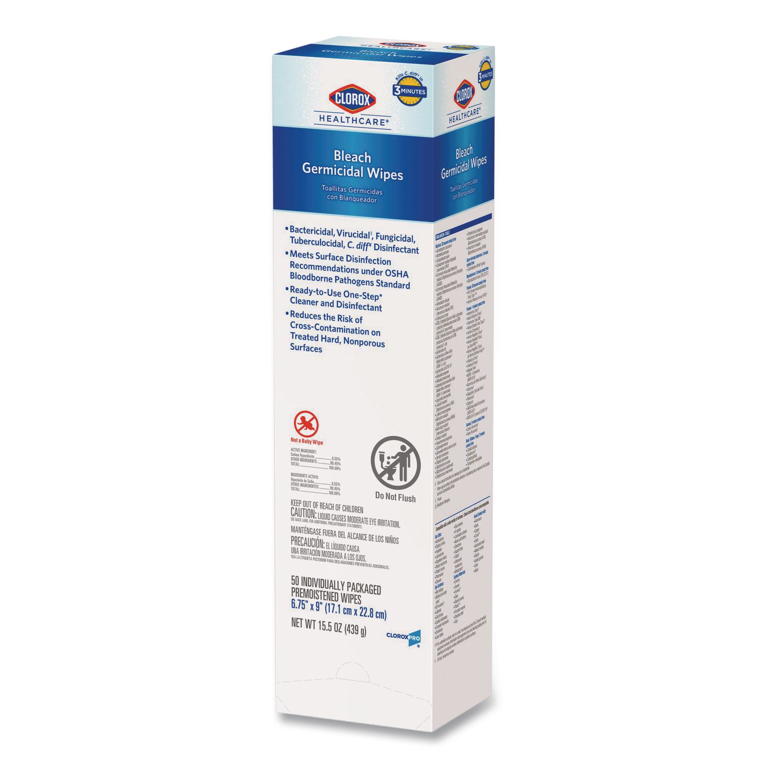 Your proven bleach solution for cleaning. Clorox Healthcare® Bleach Germicidal Wipes kill C. difficile and C. auris in three minutes and 58 other microorganisms in one minute or less, including outbreak causing viruses, emerging viral pathogens, MRSA and VRE when used as directed. With superior surface compatibility on a wide range of hospital surfaces, these disinfecting wipes help you cover more square footage per wipe with fast contact times and greater wetness surface coverage than the leading competitor. The phosphate free formula is optimized to be easy on surfaces and leaves less residue behind. Use in healthcare settings including hospitals, medical facilities, outpatient facilities and long term care facilities. Follow special instructions for cleaning prior to disinfection. Individually Wrapped Wipes-Designed for on-the-go cleaning. Towel/Wipe Type: Cleaning/Disinfecting Wipes; Applicable Material: Acrylic; Ceramic; Chrome; Fiberglass; Glass; Metal; Plastic; Tile; Vinyl; Wood; Material(s): Nonwoven Fiber; Number of Plies: 1.