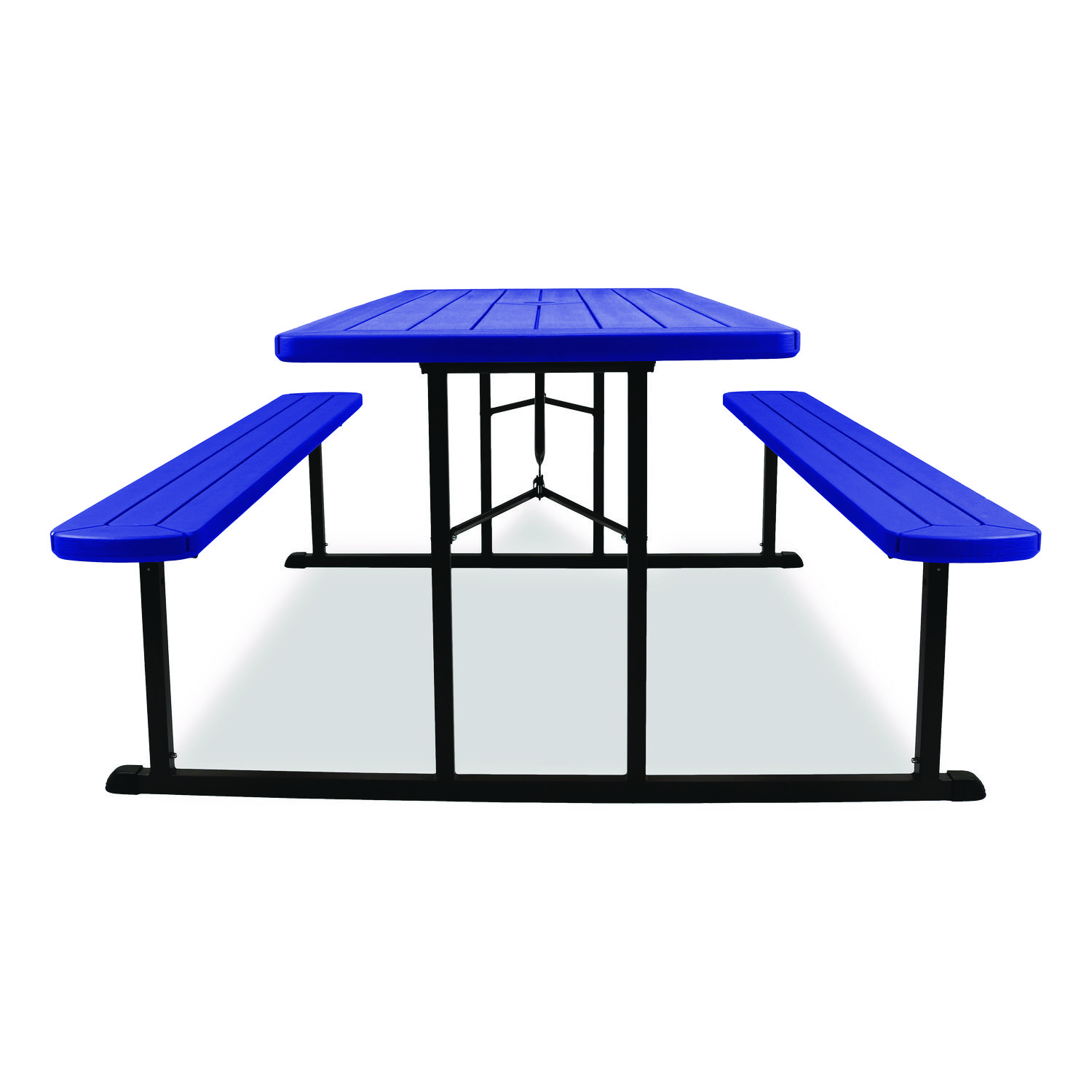 Introducing the revolutionary Folding Picnic Table by NPS, where gatherings transform into lively experiences! Crafted for those who cherish the joys of al fresco dining, this versatile table is more than just furniture—it’s your go-to companion for creating memorable moments indoors or outdoors. Our Picnic Table is designed for your convenience and comfort. Folds flat to 3″ height for efficient portability and storage, and features a convenient hole (with a cover) for umbrella placement, ensuring comfort on sunny days. With non-marring glides and gravity locks with clicking mechanism, stability is guaranteed for uninterrupted enjoyment with loved ones. Plus, its 1.6″ tabletop and bench thickness offer sturdy support for all your dining needs. Our picnic table is there to make every occasion special, offering ample space for friends and family to gather, share meals, laugh and create lasting memories. Crafted for year-round enjoyment, indoors and outdoors, the picnic table is effortlessly storable when not in use or during rainy periods. Built to withstand the summer heat, our picnic table is constructed from high-quality heat-resistant materials, ensuring durability for years to come. With built-in benches, there’s no need for extra seating—everyone has a comfortable spot to sit and enjoy the space. Setting up the table is a breeze with easy assembly instructions, transforming any space into a cozy spot for picnics, games and relaxation. Its timeless design seamlessly blends into any outdoor setting, whether in your backyard, dining hall, at the beach or in a community park, adding charm and functionality wherever it goes. Elevate your gatherings with our Picnic Table—the perfect blend of style, durability, and convenience for all your al fresco adventures! Top Color: Blue; Color Family: Blue; Base Color: Black; Top Shape: Rectangular.