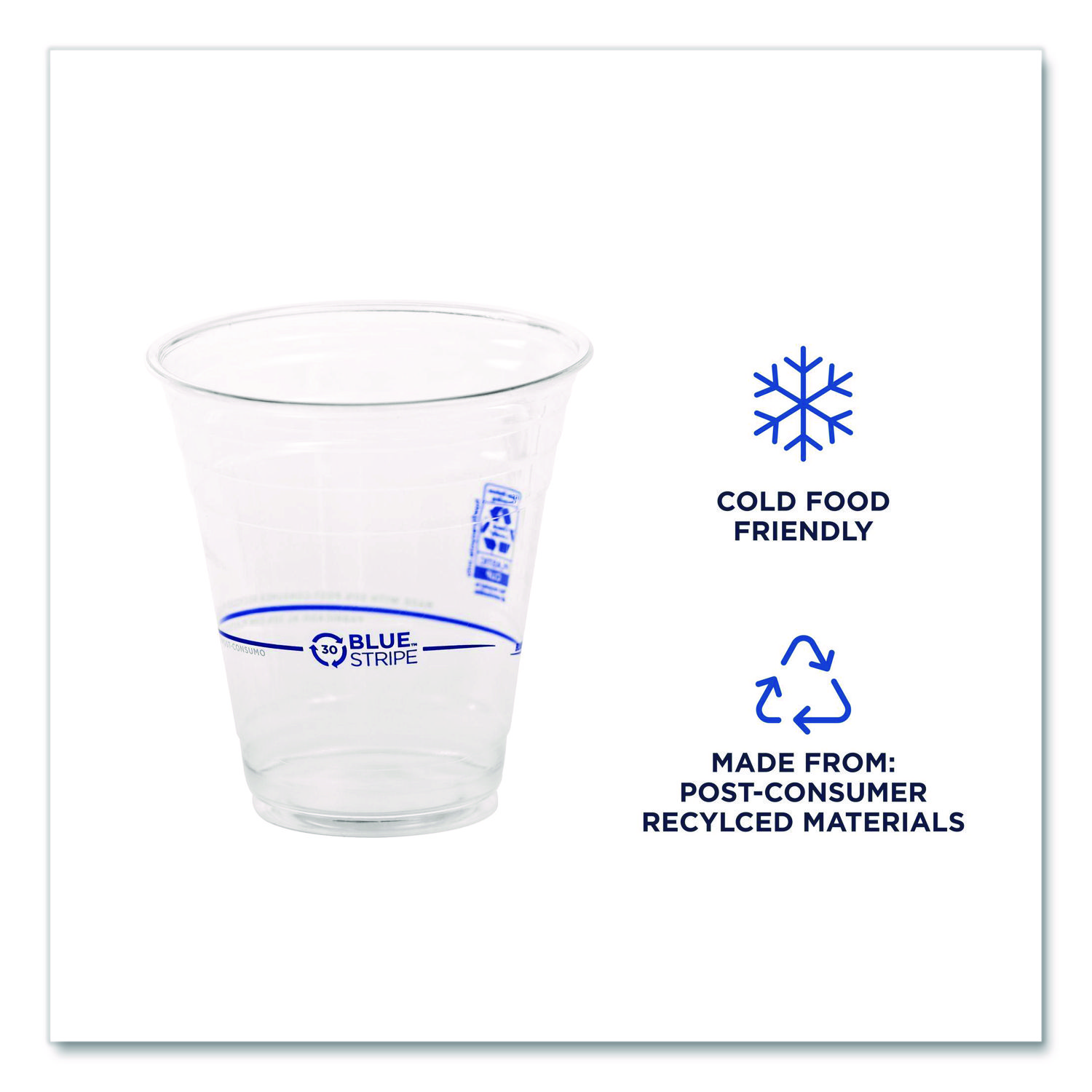 Opt for the durable and appealing BlueStripe™ cups, designed to combine strength with style. These cups are partially made from recycled PET bottles, contributing to environmental sustainability. Each cup features detailed information about its recycled content, highlighting the commitment to sustainabiity practices. The BlueStripe™ cups offer both functionality and a sleek appearance, making them a practical choice for any event or daily use. Sized to suit most beverage needs. Their robust construction ensures reliability while their recycled materials reflect a dedication to reducing waste. Choose BlueStripe™ cups to enhance your service with a responsible and attractive option. Cup Type: Cold Cup; Interior Volume Capacity: 12 oz; Material(s): 25% Recycled PET Bottles; Material Type: Plastic.