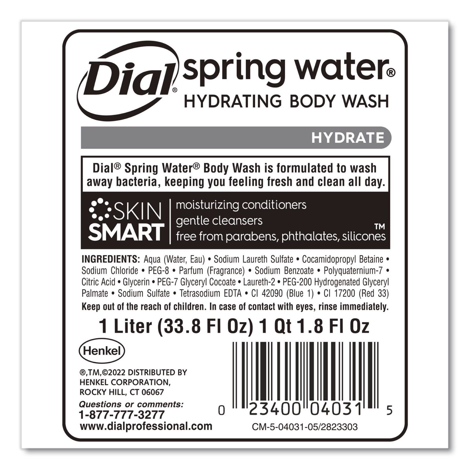 Dial® Spring Water® Body Wash is formulated to wash away bacteria, keeping you feeling fresh and clean all day. For Use with Dial® Professional 1 Liter Manual Liquid Dispenser. Soap Type: Body Wash; Volume Capacity: 1 L; Scent: Spring Water; Personal Soaps Application: Body; Hair.