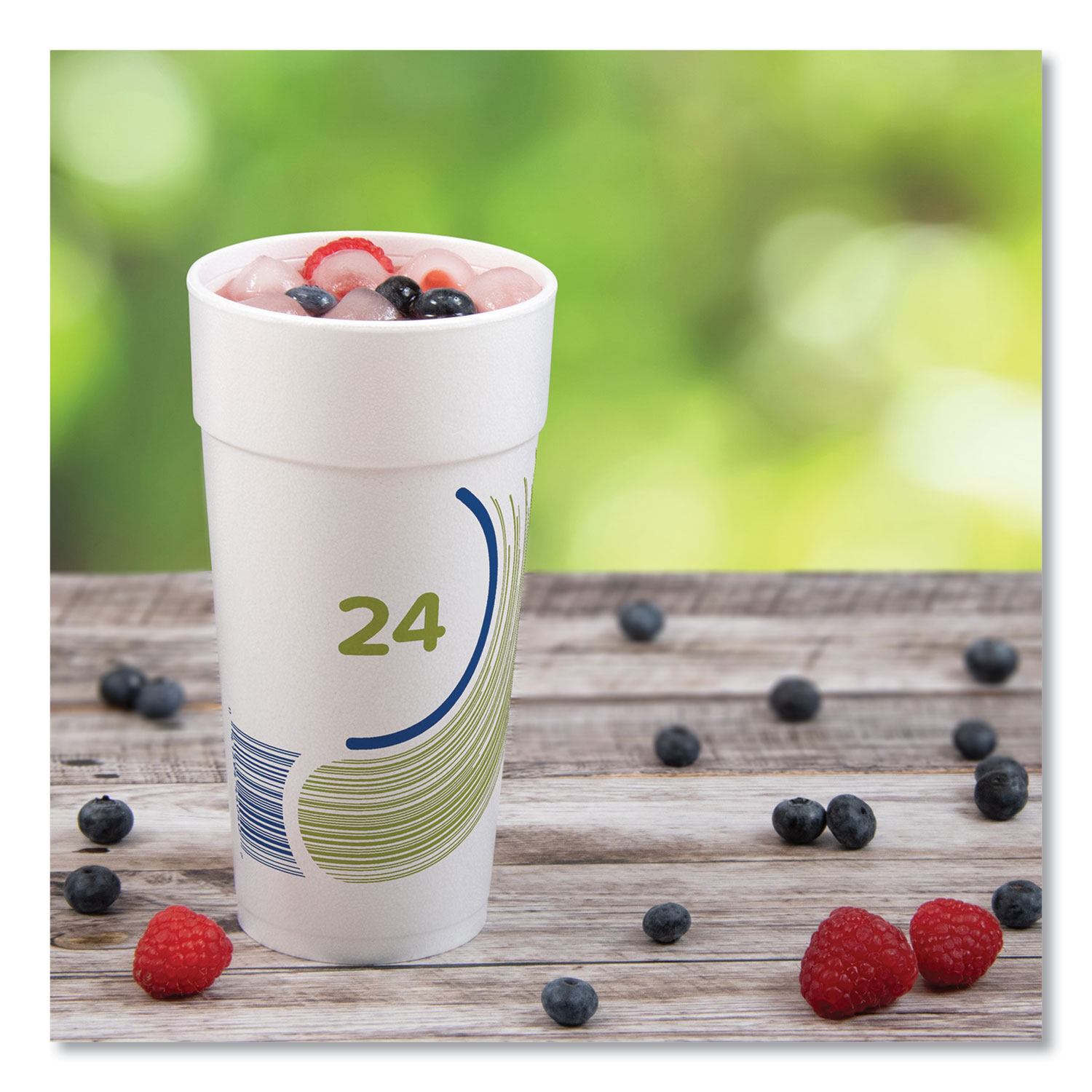 Breeze insulated foam cups by Dart make cashing out customers a breeze! Take control of inventory and make check out easy with barcodes printed directly on each cup. Keep hands comfortable while keeping beverages at the perfect temperature. Whether your customer is grabbing a soft drink or cappuccino, these cups will make for the perfect quick and easy offering. Cup Type: Hot/Cold Cup; Interior Volume Capacity: 24 oz; Material(s): Expanded Polystyrene (EPS); Material Type: Foam.