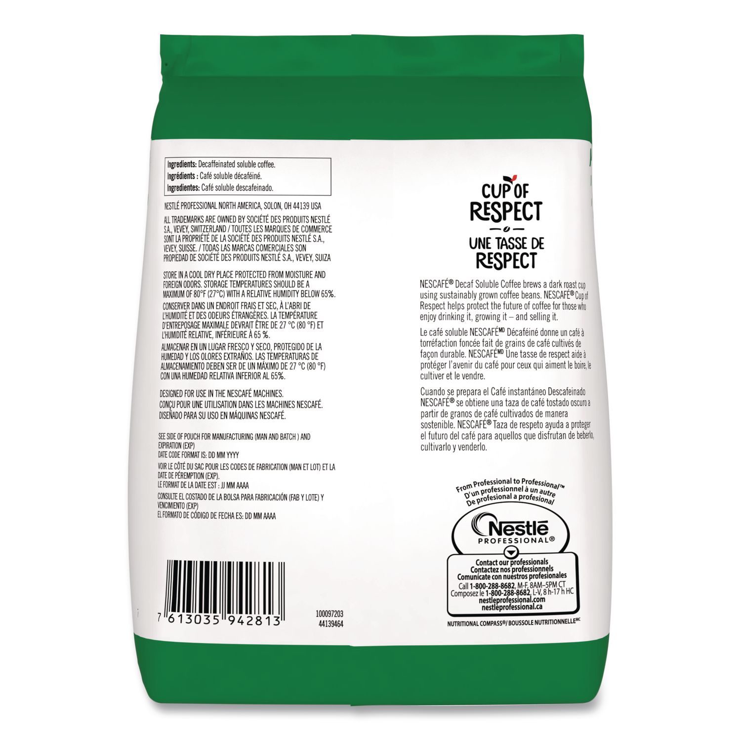 This decaffeinated dark roasted coffee blend is a smooth yet juicy mild coffee with roast flavors and Arabica notes. Developed by a team of experts, the new Nescafé® Micro Roasted Coffee technology preserves the fresh taste of quality roasted beans by encasing them within a soluble coffee granule. The beans are also milled 10 times finer than traditional grinds so the flavor is dispersed more evenly. The result is an instant coffee with a fuller, fresher flavor. Beverage Type: Decaffeinated Coffee; Flavor: Arabica; Roast Type: Dark Roast; Product Packaging: Bag.