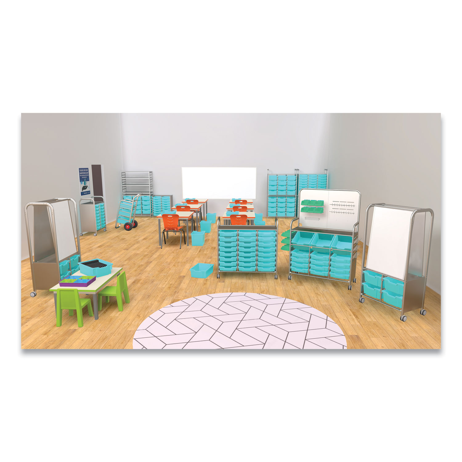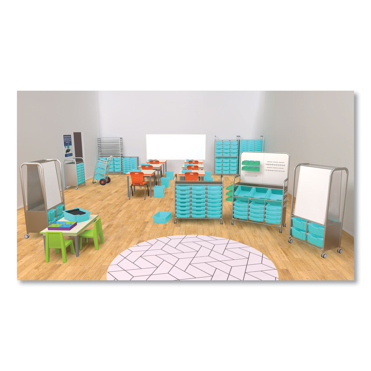 Versatile, modern and secure Callero Plus Treble Column Trolley features BioCoteĀ® antimicrobial technology embedded in its finish and within the construction of its included bins to reduce the potential for the growth of bacteria, mold and fungi by up to 99.99% it’s even been tested and proven to be effective after years of exposure to commonly used disinfectants and cleaning products to ensure long-lasting protection and lasting peace of mind. And like all Callero Plus trolleys, Treble Column Trolleys with Antimicrobial Protection are designed with STEM, STEAM and collaborative learning in mind, with a multi-bin concept and a triple-wide format to deliver ultimate flexibility. Transport your equipment from place to place and create a one-stop central location for all of your students’ necessary supplies. Child-friendly StopSafe runners make it easy to access the bins’ contents while preventing the bins from being pulled out of their slot, eliminating the possibility of messy, accidental spills. At the same time, the runners can be removed and/or adjusted by those in the know to accommodate any size F-series tray: deep or shallow, either or both in one trolley. Durable steel frame is enclosed on the sides for added security, and both the frame and panels feature a tough, powder-coat finish to protect it from the rigors of daily use. Completely free of sharp corners and edges, these carts are also ideal for students of all ages, from Pre-K through adult learning. Ergonomic handles and included casters (two locking) make it easy to maneuver the cart either down the hall or fully across campus, and four included glides give you the option of using your Treble Column Trolley for either fixed storage or fully mobile transport. Set 17: 16 F1 Shallow Bins and 4 F2 Deep Bins. Material(s): Plastic; Steel; Overall Material Type: Metal; Color(s): Silver/Translucent Kiwi; Color Family: Green.