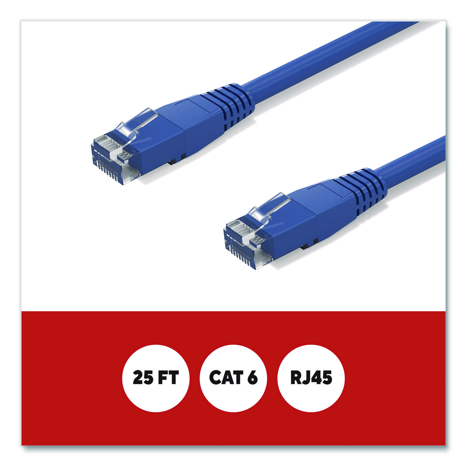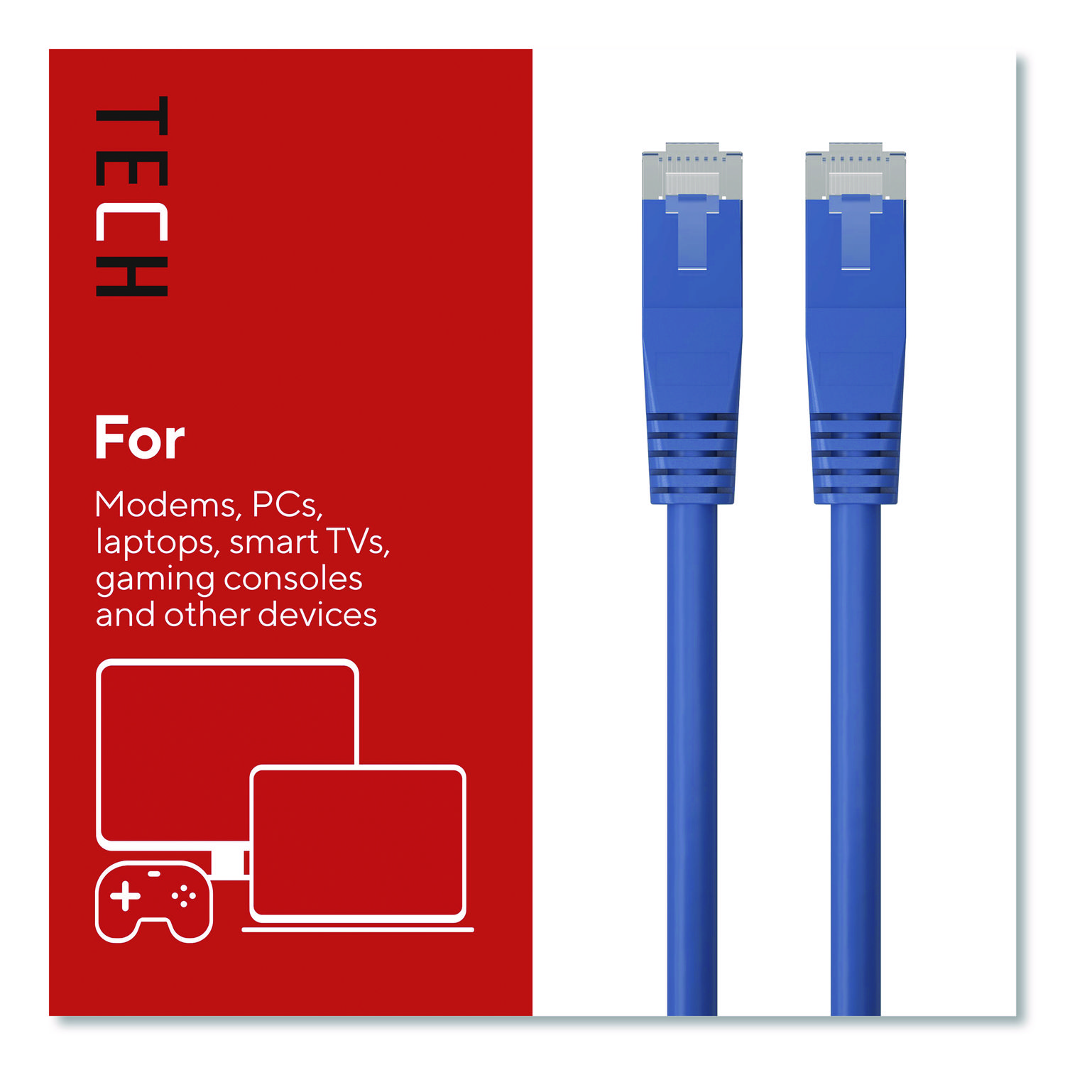 Connect high-speed network devices – like modems, PCs, laptops, smart TVs, gaming consoles and more – with this Staples TECH Ethernet cable. It provides ample length to connect from across the room, while the CAT6 configuration offers data transfer speeds up to 10 Gbps for fast performance. This Staples TECH CAT6 Ethernet cable has snag-free RJ45 connectors for an efficient and stable signal between compatible devices. Cable Type: CAT6 Patch Cable; Connector/Port/Interface: RJ 45 Male to Male; Cable Length: 25 ft; Jacket Color: Blue.