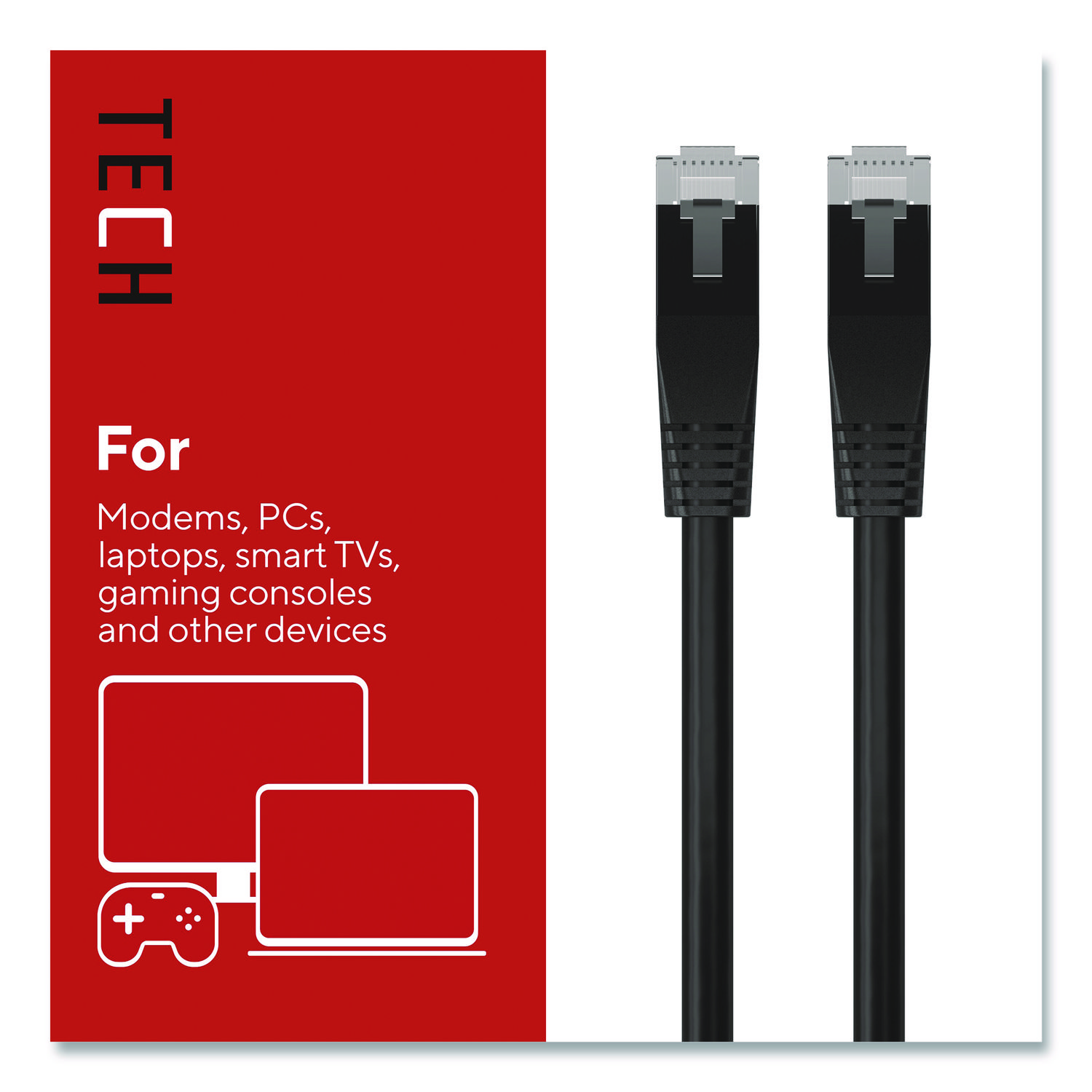 Connect high-speed network devices – like modems, PCs, laptops, smart TVs, gaming consoles and more – with this Staples TECH Ethernet cable. It provides ample length to connect from across the room, while the CAT6 configuration offers data transfer speeds up to 10 Gbps for fast performance. This Staples TECH CAT6 Ethernet cable has snag-free RJ45 connectors for an efficient and stable signal between compatible devices. Cable Type: CAT6 Patch Cable; Connector/Port/Interface: RJ 45 Male to Male; Cable Length: 50 ft; Jacket Color: Black.