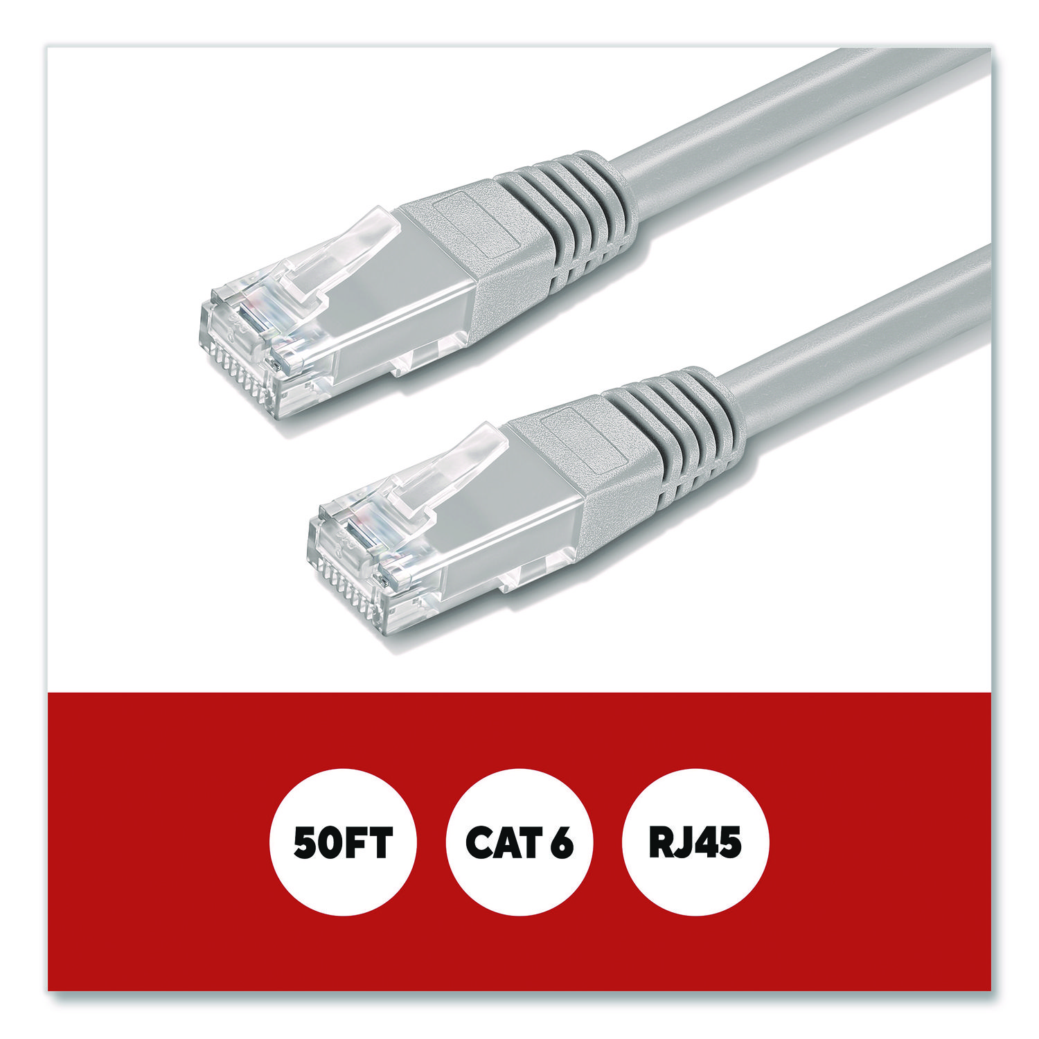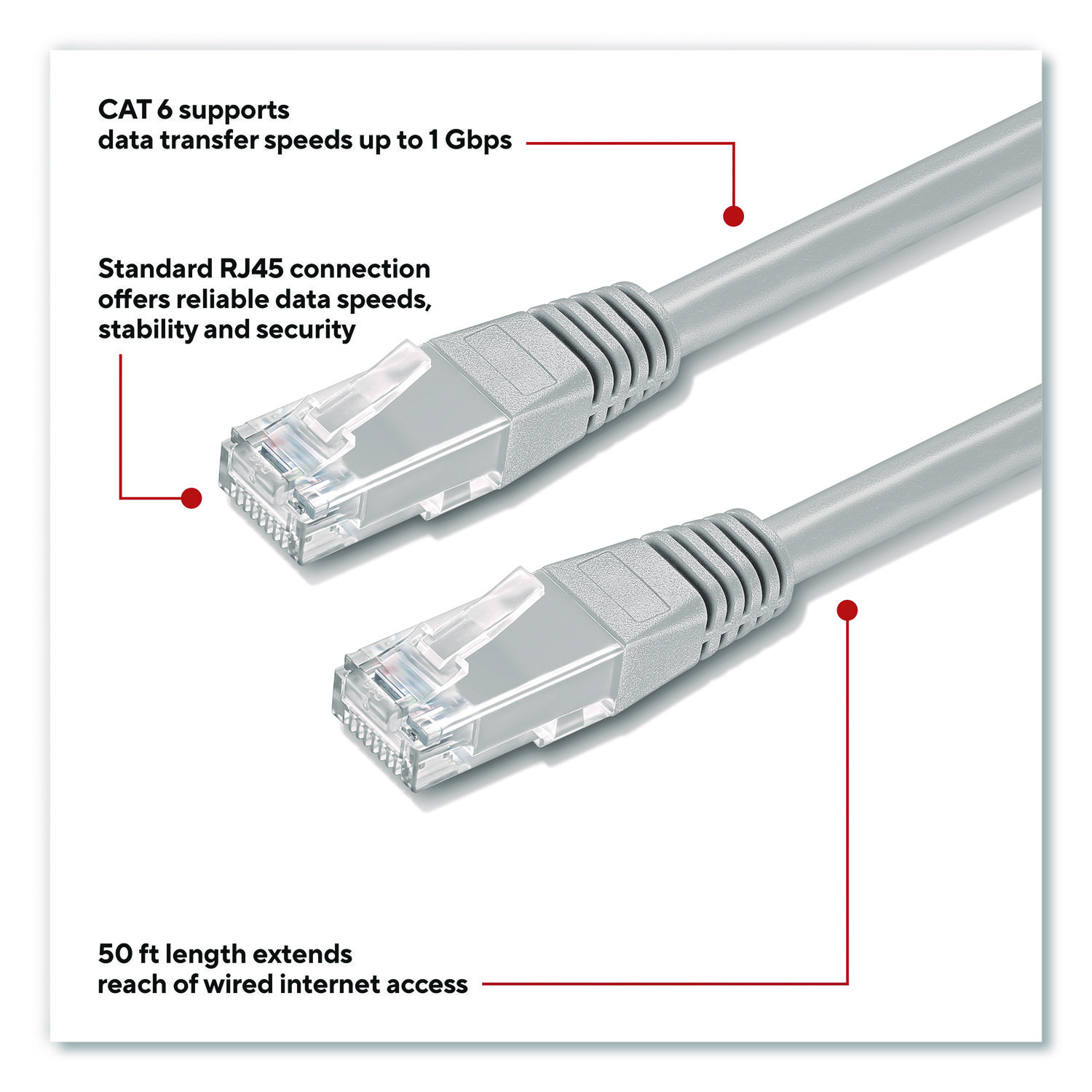 Connect high-speed network devices – like modems, PCs, laptops, smart TVs, gaming consoles and more – with this Staples TECH Ethernet cable. It provides ample length to connect from across the room, while the CAT6 configuration offers data transfer speeds up to 10 Gbps for fast performance. This Staples TECH CAT6 Ethernet cable has snag-free RJ45 connectors for an efficient and stable signal between compatible devices. Cable Type: CAT6 Patch Cable; Connector/Port/Interface: RJ 45 Male to Male; Cable Length: 50 ft; Jacket Color: Gray.