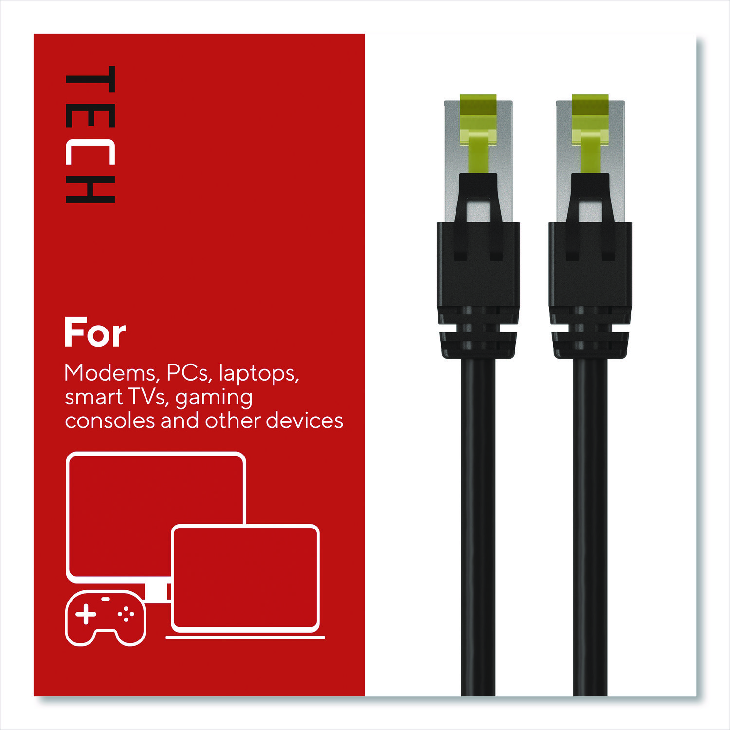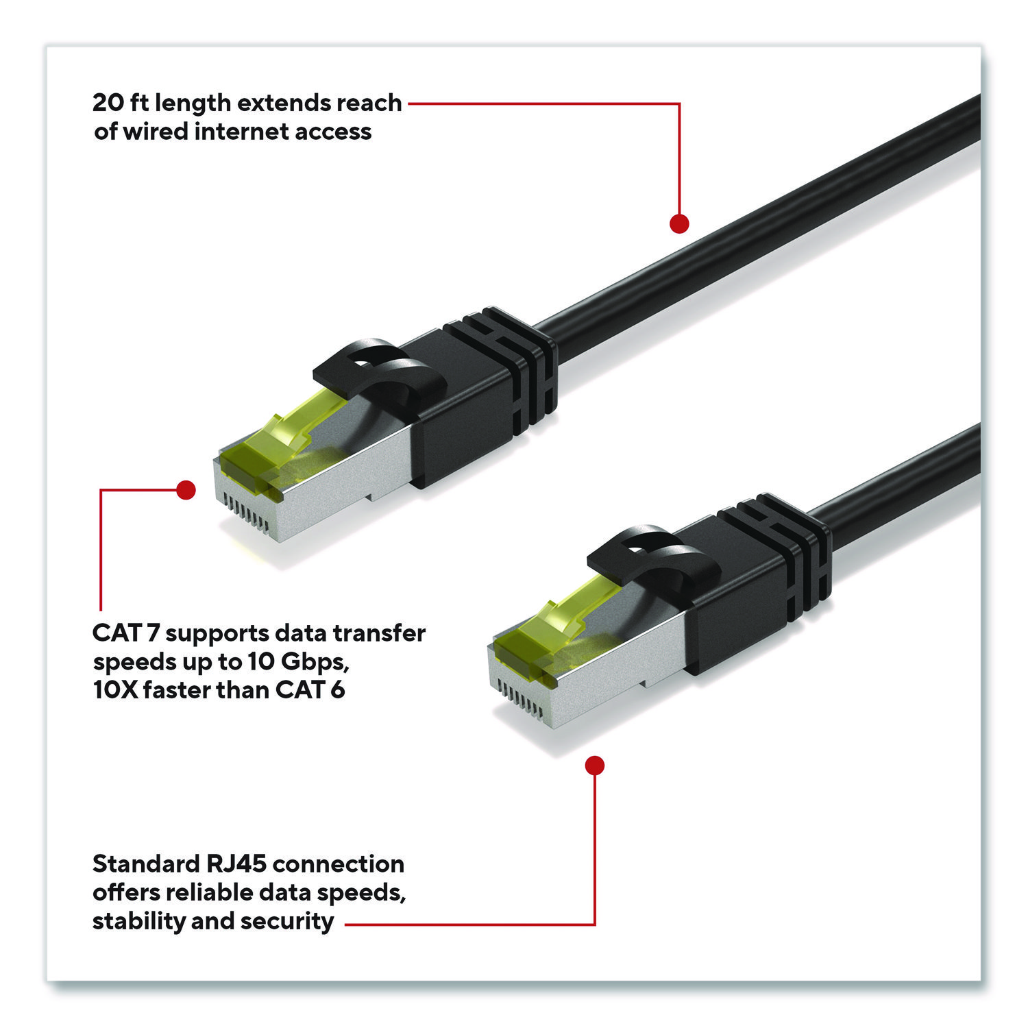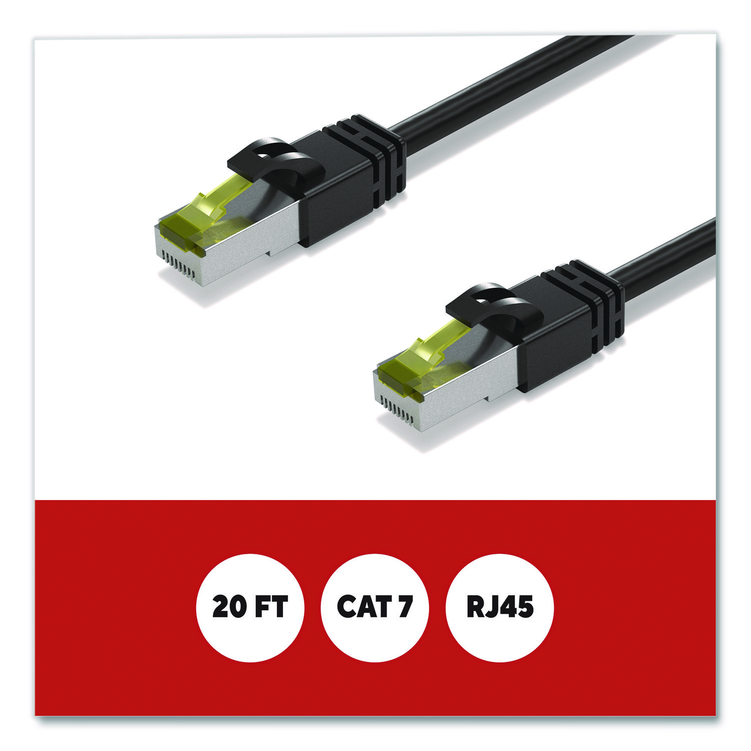 Connect high-speed network devices – like modems, PCs, laptops, smart TVs, gaming consoles and more – with this Staples TECH Ethernet cable. It provides ample length to connect from across the room, while the CAT7 configuration offers data transfer speeds up to 10 Gbps for fast performance. This Staples TECH CAT7 Ethernet cable has snag-free RJ 45 connectors for an efficient and stable signal between compatible devices. Cable Type: CAT7 Patch Cable; Connector/Port/Interface: RJ 45 Male to Male; Cable Length: 20 ft; Jacket Color: Black.