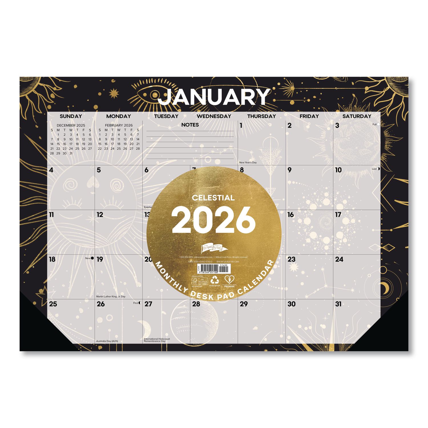 Celestial Small Monthly Desk Pad Calendar, 17 x 12, Black/Gold/Gray Sheets, Black Headband/Corners, 12-Month (Jan-Dec) 2026