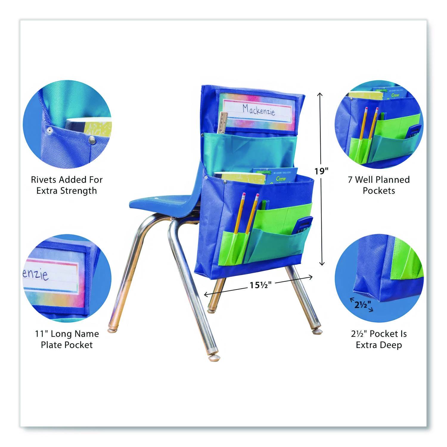 Teacher Created Resources classroom storage will have any room organized in no time! Organize supplies with this convenient storage solution. Clear pocket holds name plate up to 3.5″ x 11.5″. Features seven storage areas including large pockets that are ideal for workbooks and folders and small pockets that are ideal for supplies. Made with durable canvas. Metal rivets provide extra strength at stress points. Easily slides over back of chair up to 15″ wide, 5″ from top. Color(s): Blue/Teal/Lime; Color Family: Blue; Material(s): Canvas; Material Type: Fabric.