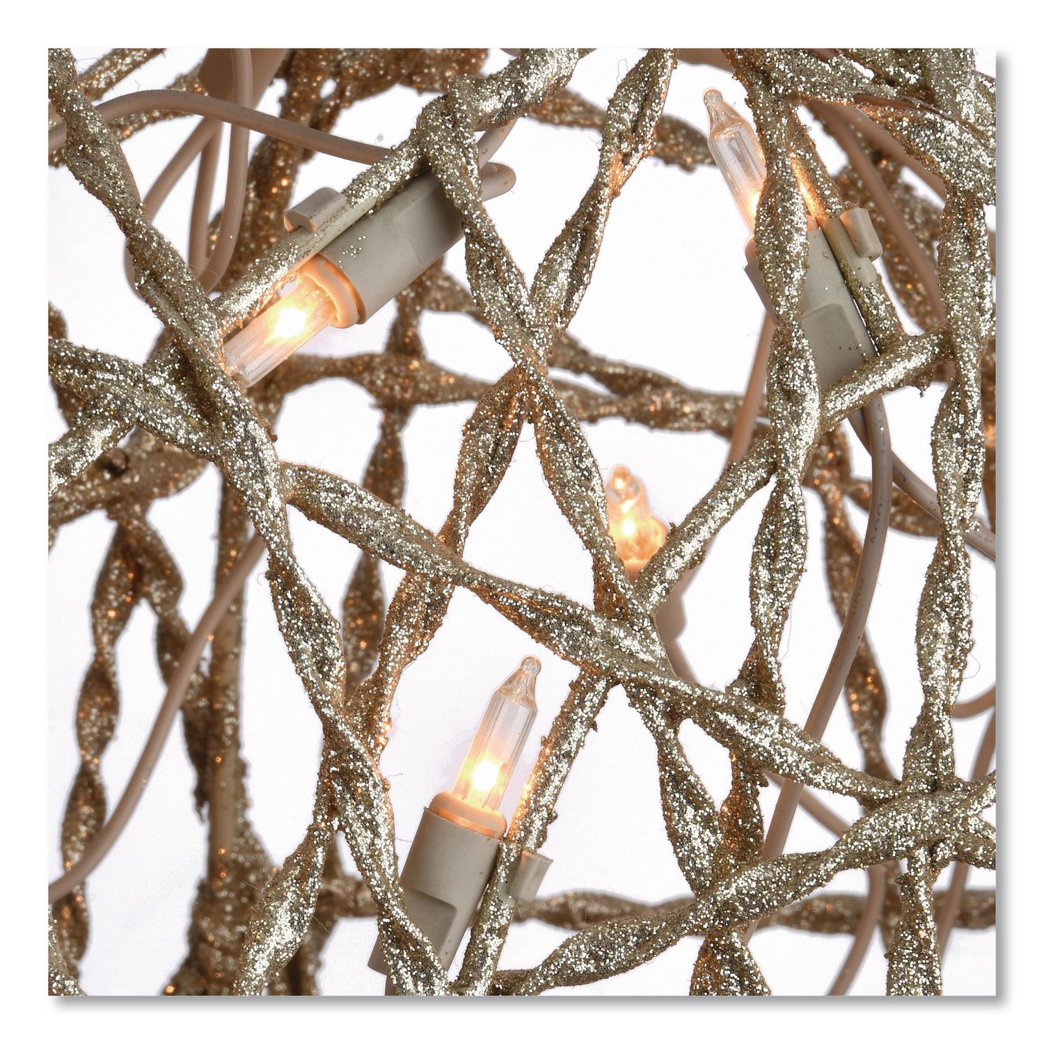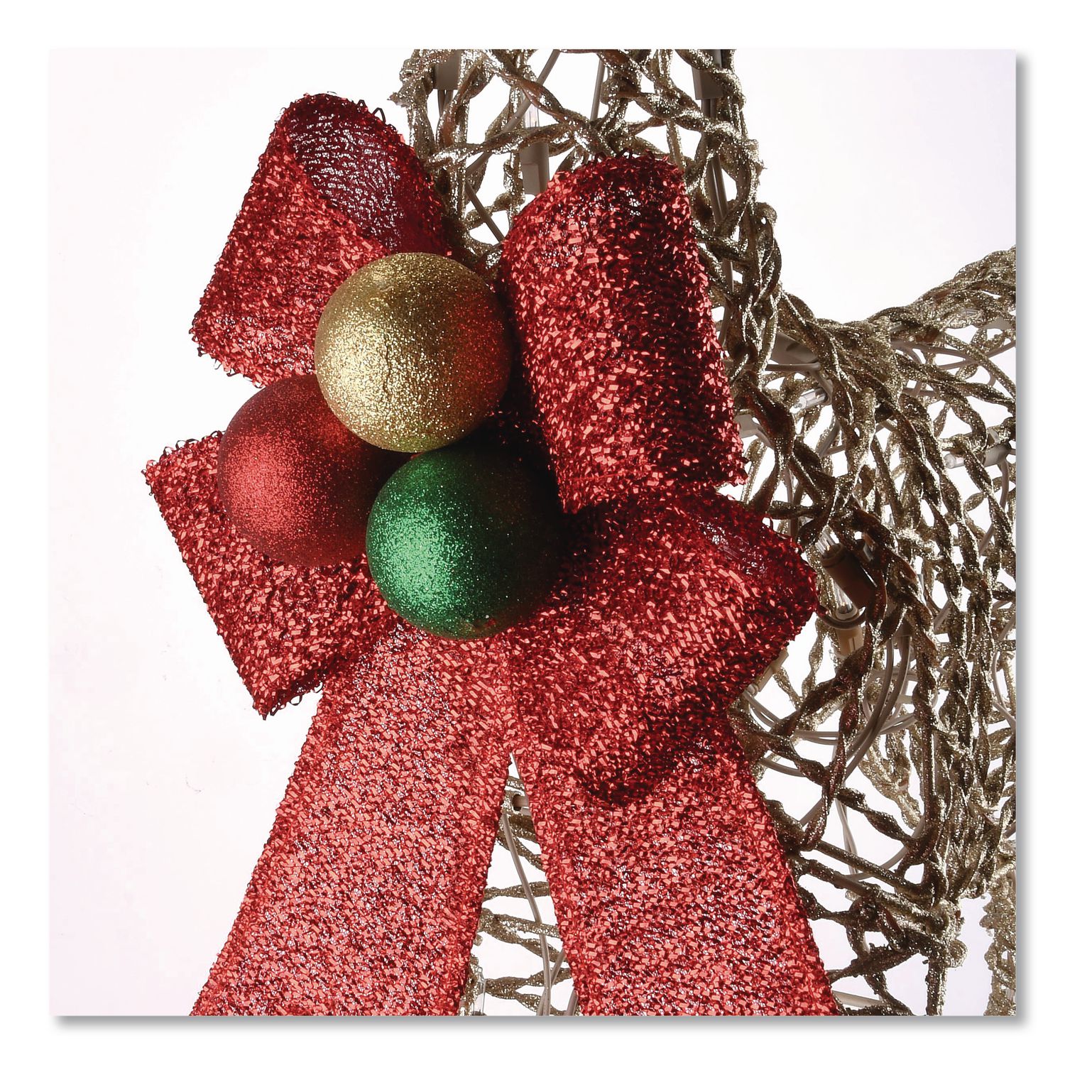 This set of three deer including Buck, Doe, and Fawn is constructed of strong braided acrylic mesh that is sprinkled with glitter and wrapped around a sturdy wire frame. Each has a red ribbon bow with colorful ball ornaments as an attractive embellishment. They are lit with a combined total of 370 warm white LED lights. For indoor or outdoor display. Ground stakes are included. Holiday/Season: Christmas; Indoor/Outdoor: Indoor/Outdoor; Color(s): Champagne; Color Family: Gold.