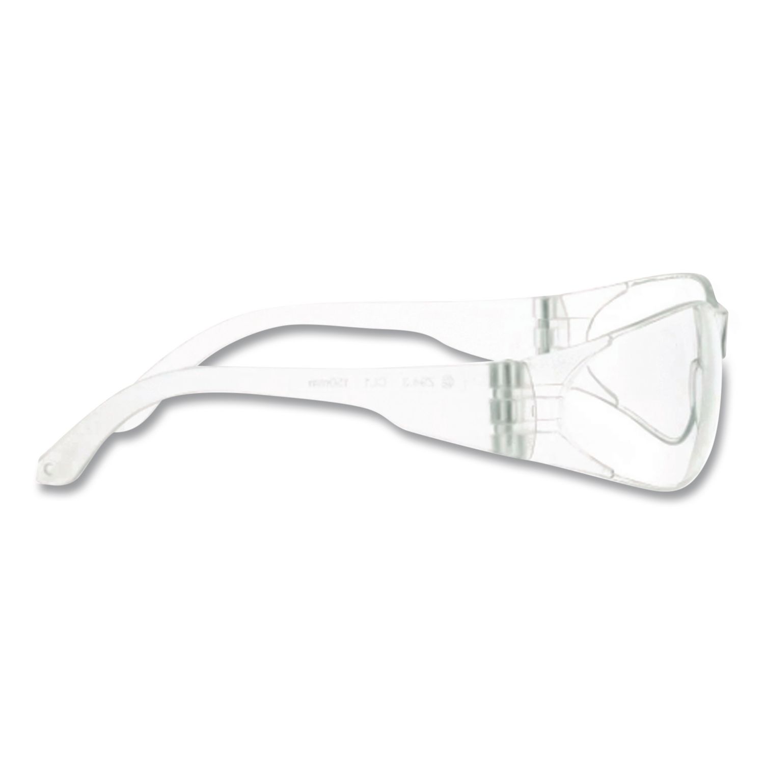 Near total coverage of eye orbit assures high level of protection. Exclusive Duramass® scratch-resistant and anti-fog lens. Safety Glasses Style: Frameless; Arm Color: Clear; Frame/Arm Material: Polycarbonate; Lens Style: Single Lens.