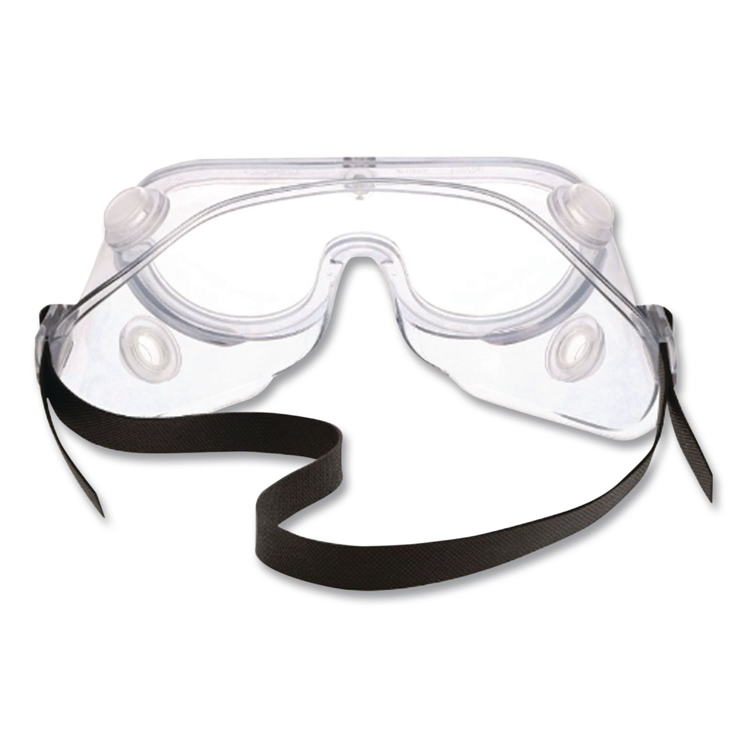 Provides a wide, unobstructed field of vision and can be worn with most half-mask respirators. Transparent PVC body permits a comfortable fit over glasses. Protects against impact, splash. Chemical-Splash Goggles—Indirect venting. Transparent protective PVC body permits a comfortable fit while protecting against impact and splash. OTG: Yes; Venting: Indirect; Wraparound Lens: No; Lens Color: Clear.