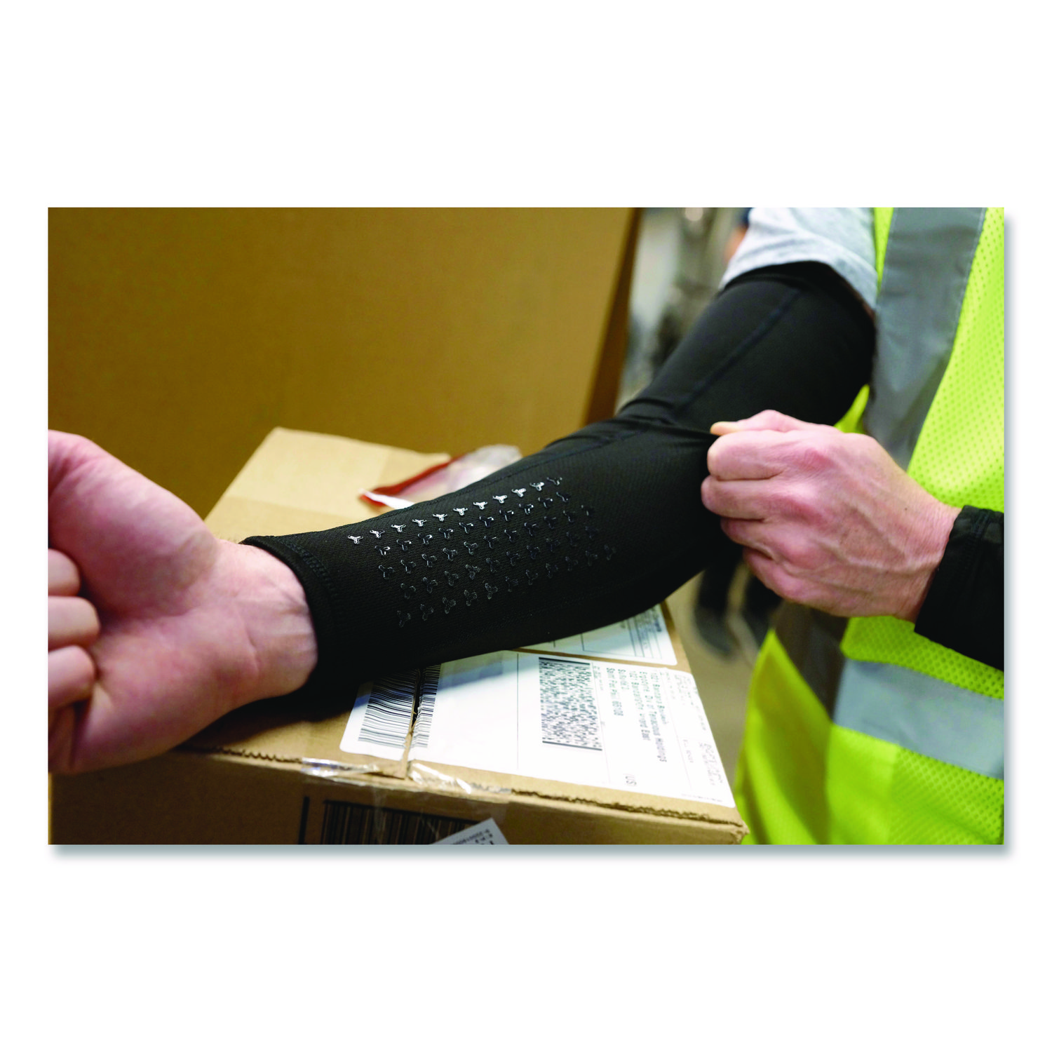 The 6691 Cooling Arm Sleeves are designed for cooling relief and added leverage when lifting bulky items. For an instant cooling effect lasting up to two hours, activate the sleeves with water. When worn dry, the soft, stretchy performance fabric draws sweat away from the skin, which also helps regulate body temperature. Whether wet or dry, the breathable knit fabric provides UPF 50+ sun protection from harmful UV rays and guards against light abrasions––ideal for landscaping or hauling brush. To help workers get a better handle on bulky items, silicone grips have been added to the forearms to decrease slipping against surfaces like cardboard boxes. Reflective accents bring increased visibility to low-light conditions, while an anti-odor treatment keeps things fresher between washes—a practical choice for active wearers. Sleeves come in a convenient two-pack including both left and right arm sleeves. Ideal for delivery drivers and warehouse workers who regularly lift and carry boxes, tools or heavy objects, this gear provides essential support and comfort throughout the day, helping to reduce strain and enhance productivity on the job. Apparel Type: Cooling Sleeve; Material(s): Polyester; Spandex; Color(s): Black; Color Family: Black.