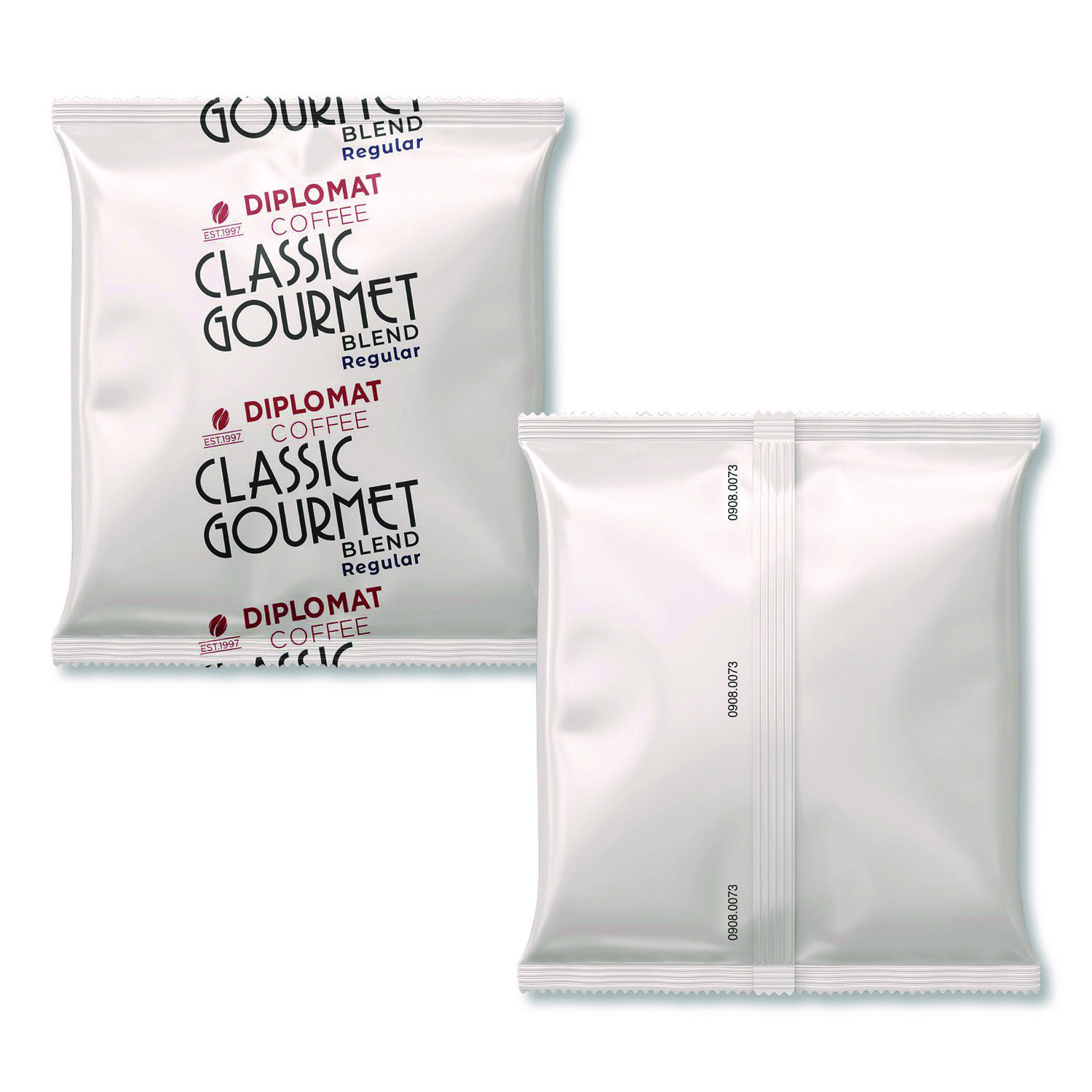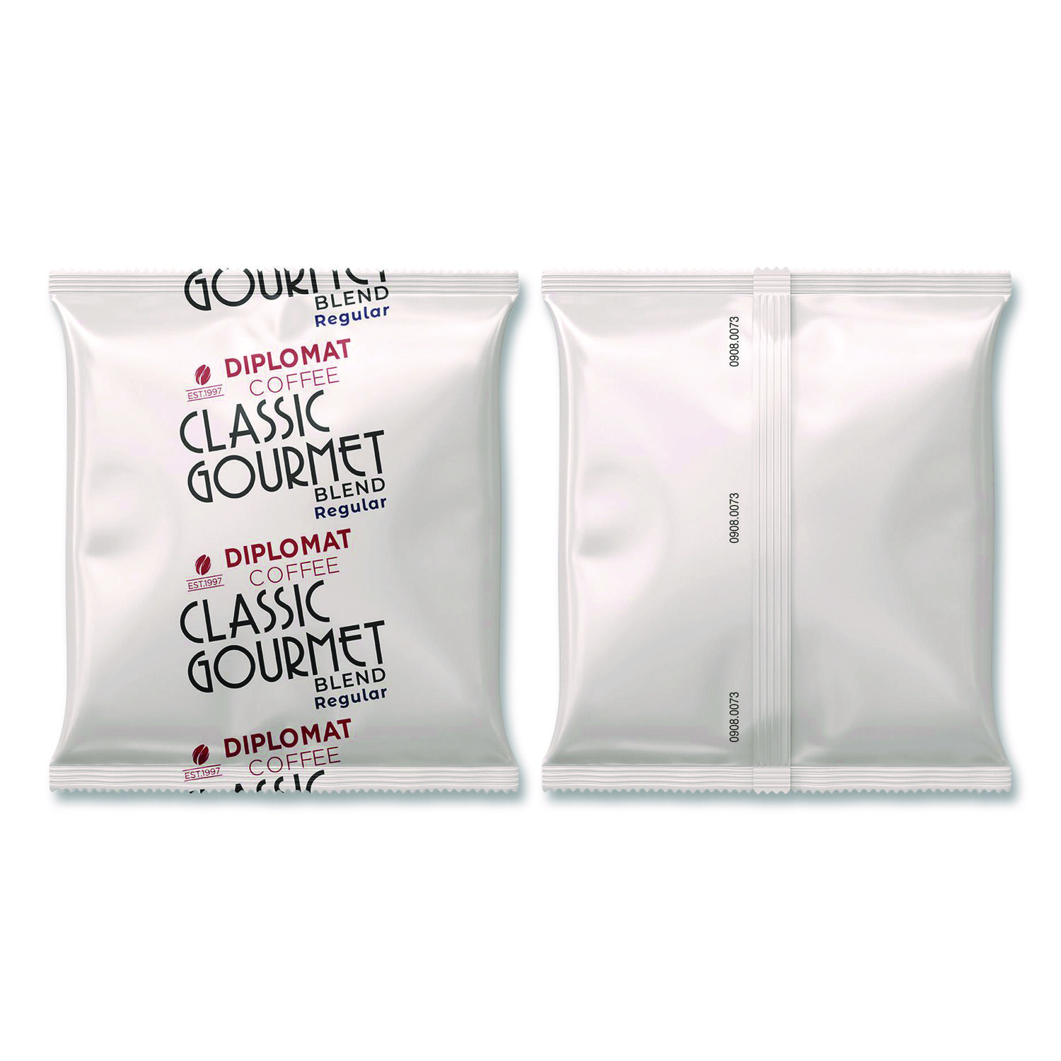 For those who appreciate the rich tradition of expertly roasted coffee, Diplomat Coffee’s Classic Gourmet delivers a cup that’s as smooth as it is bold. Carefully crafted from the finest beans, this premium blend is roasted to perfection, balancing deep, toasty aromas with rich flavors of dark chocolate, roasted nuts and a touch of caramelized sweetness. From the first sip, you’ll notice its full-bodied complexity and velvety texture—an ideal companion for early mornings, midday breaks or those moments when only a truly exceptional coffee will do. Whether enjoyed black for a pure, robust experience or with your favorite milk for added creaminess, Classic Gourmet promises a consistently satisfying cup, every time. At Diplomat Coffee, we believe great coffee is more than just a drink—it’s a ritual, a moment of indulgence, and a daily source of inspiration. That’s why we’ve perfected this blend to offer the perfect balance of strength, smoothness and unmistakable quality. Choose Classic Gourmet and taste the craftsmanship in every sip. Beverage Type: Coffee; Flavor: Classic; Roast Type: Medium; Product Packaging: Fraction Pack.