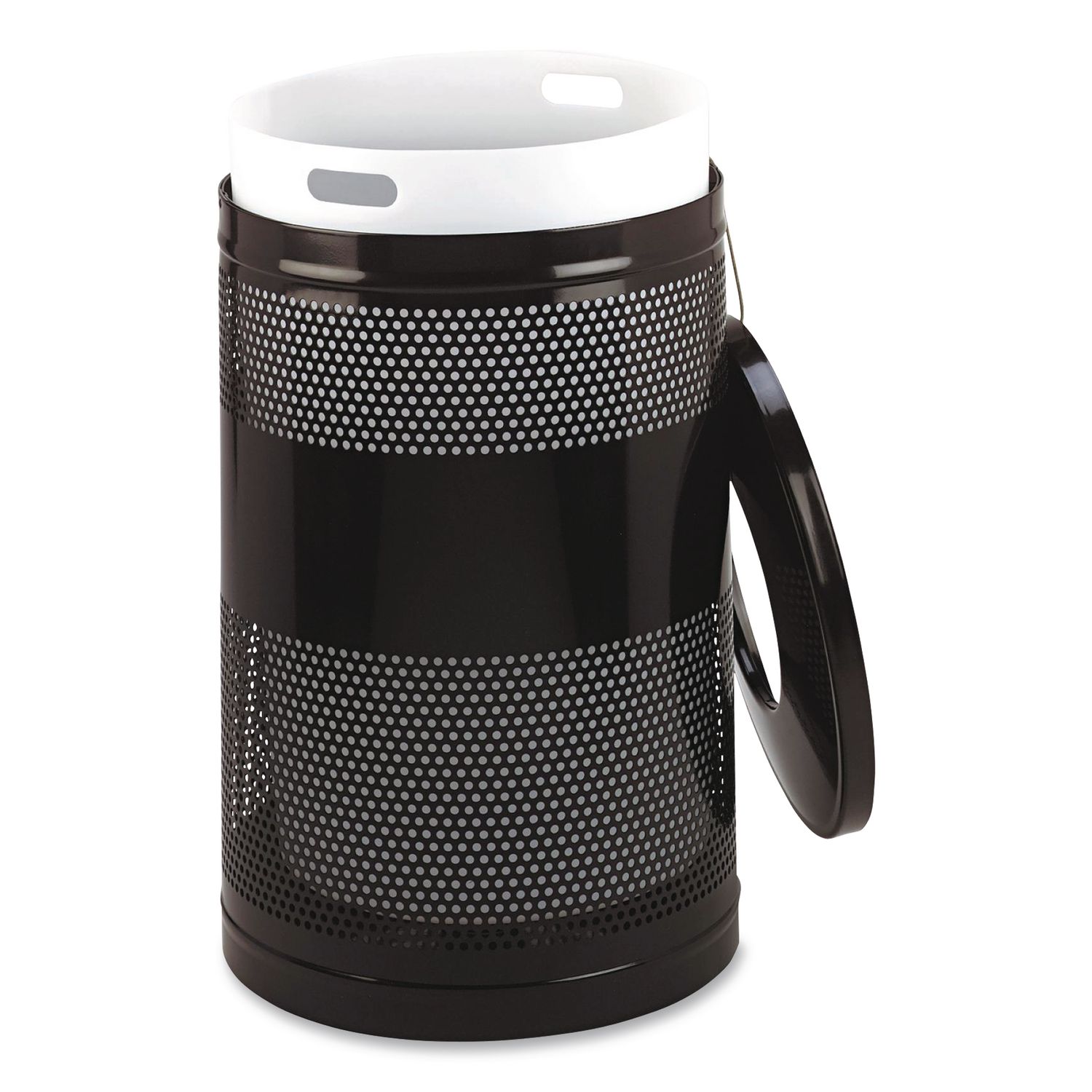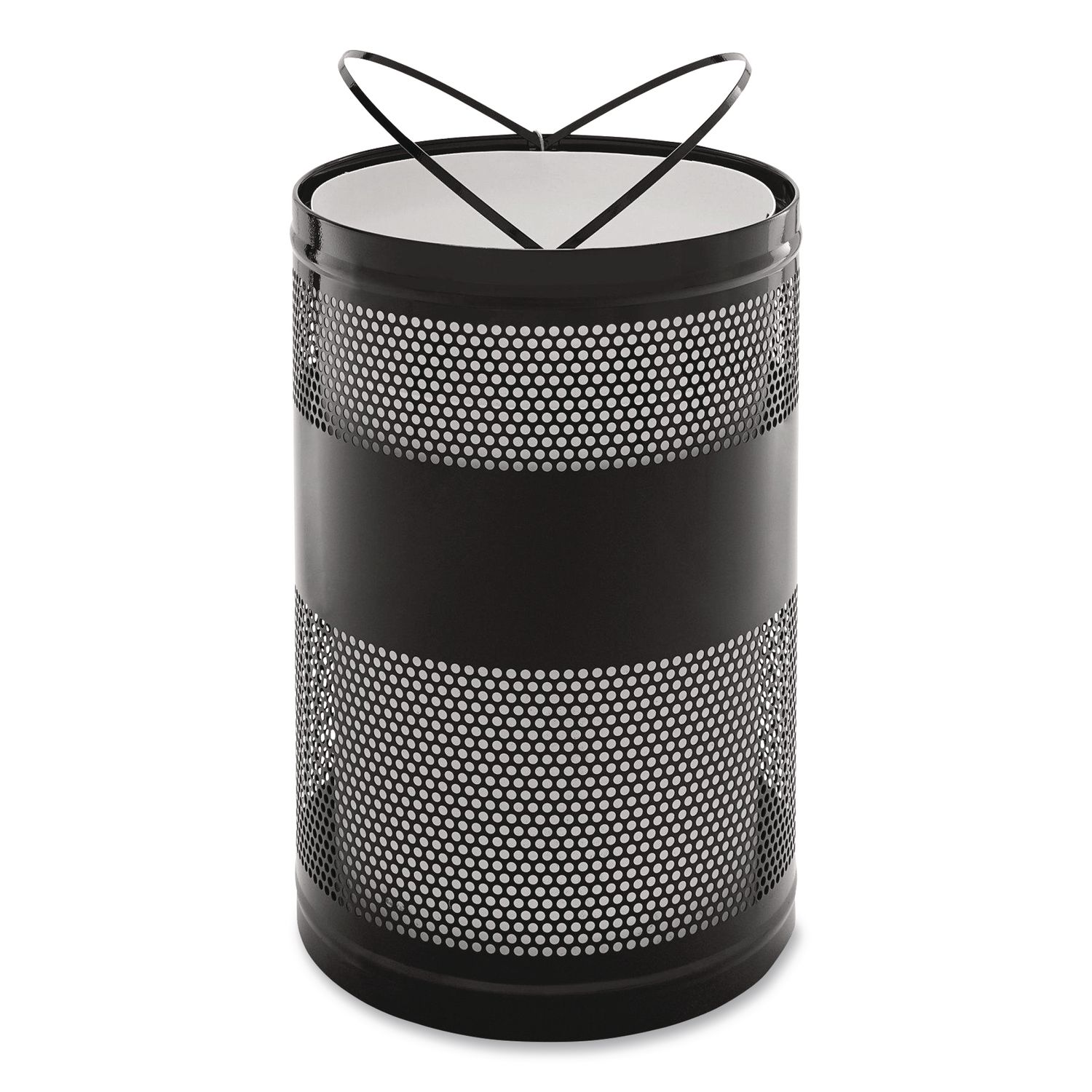 Perforated steel design with a clean, modern appearance. Lift-off, cable secured top allows easy access to inner liner for maintenance. Dual retainer bands secure poly bags neatly inside receptacle. Leakproof rigid plastic liner. UV protected. Waste Receptacle Type: Indoor/Outdoor All-Purpose Waste Bin; Material(s): Steel; Application: Indoor/Outdoor All-Purpose Waste Disposal; Interior Volume Capacity: 51 gal.