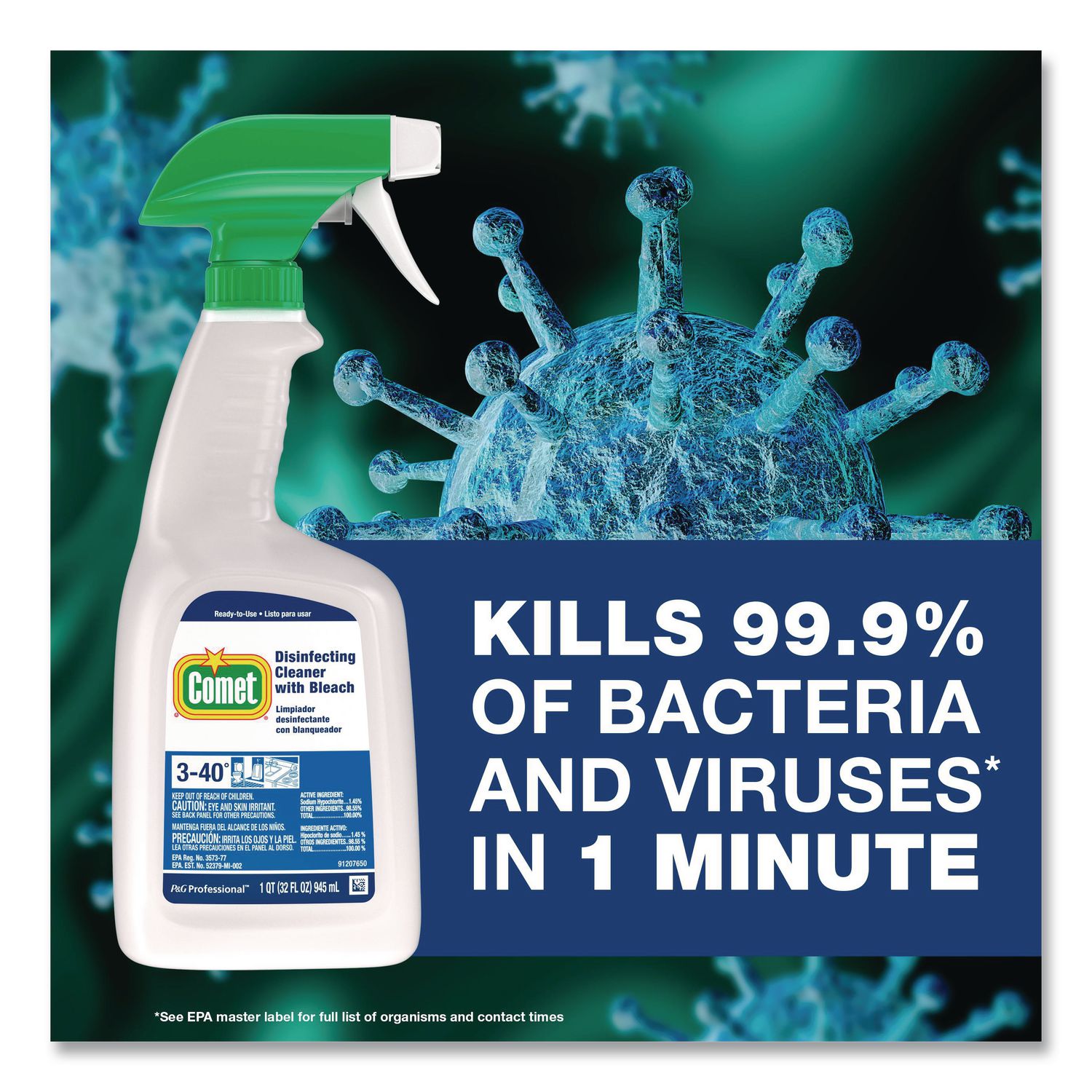Comet Disinfecting Cleaner With Bleach is a two-in-one all purpose cleaner formula that combines the cleaning power of heavy-duty detergents with the stain-removal power of bleach. A hospital-use disinfectant when used per label instructions, Comet Disinfecting Cleaner with Bleach is effective as a disinfectant in 60 seconds against Hepatitis A and C, Norovirus, and 39 other microorganisms††. Value Pack—Stock up and save! Application: All-Purpose; Applicable Material: Ceramic;Fiberglass;Plastic;Porcelain;Stainless Steel;Tile; Chemical Compound: Bleach; Dirt Types: Grease; Grime; Soap Scum.