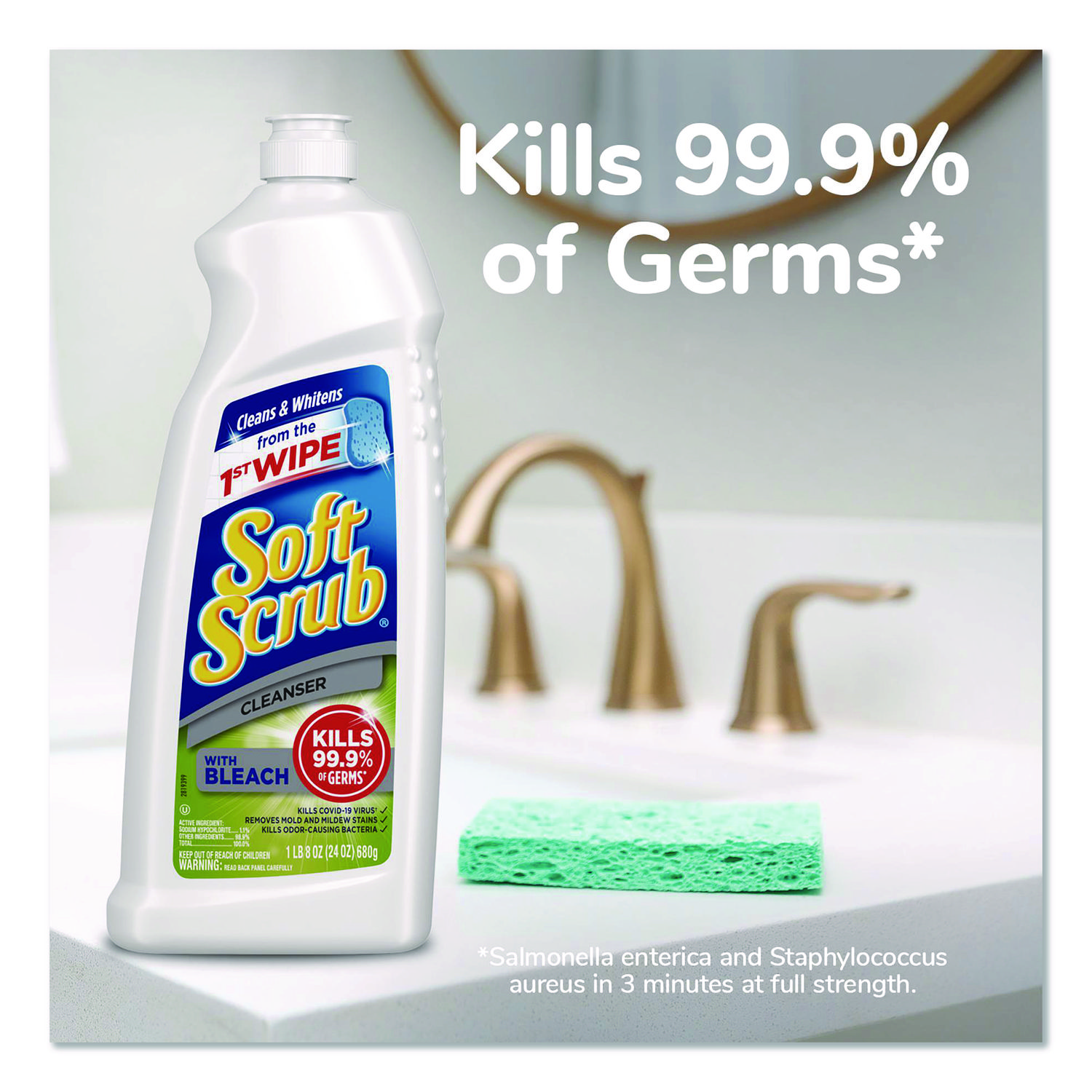 Cleans and disinfects in one step, killing 99.9% of household germs. Application: Scrub Cleanser; Applicable Material: Ceramic; Fiberglass; Plastic; Porcelain; Chemical Compound: Sodium Hypochlorite; Dirt Types: Grime; Mildew; Soap Scum; Stain.