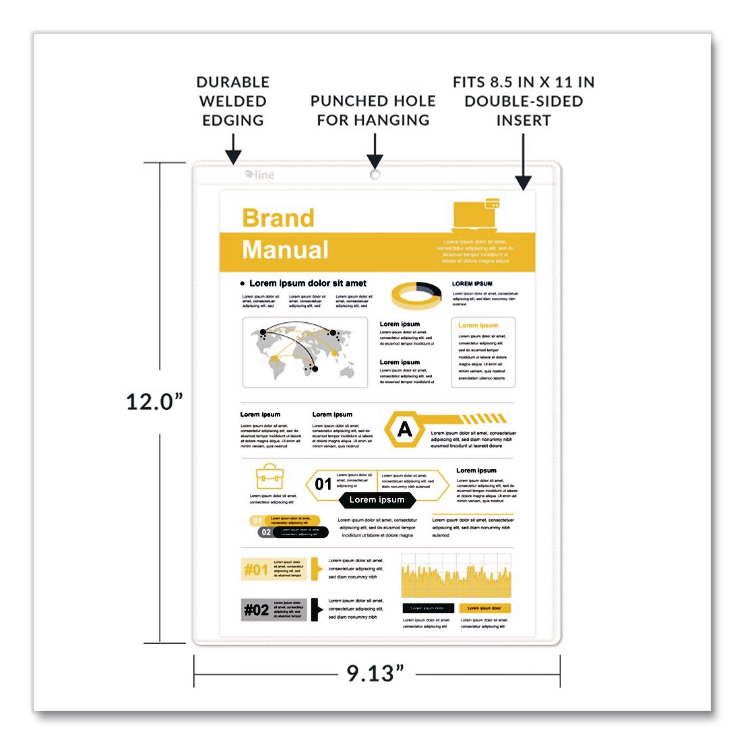 Keep job tickets, work orders, product schedules, inventory cards and more secure and protected. Super-heavyweight welded-vinyl construction and non-rip seams stand up to even the roughest use environment. Punched hole at the top allows for convenient hanging, making it easy to keep important information accessible. Clear on both sides, C-LineĀ® Clear Vinyl Shop Ticket Holders are also ideal for two-sided documents. This product will be cheerfully replaced with one of equal value if defective in materials, manufacturing or packaging at the time of purchase. Load Orientation: Top; Document Size Range: Letter; Insert Size: 8.5 x 11; Front Face Color: Clear.