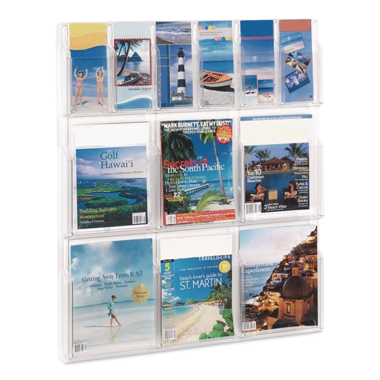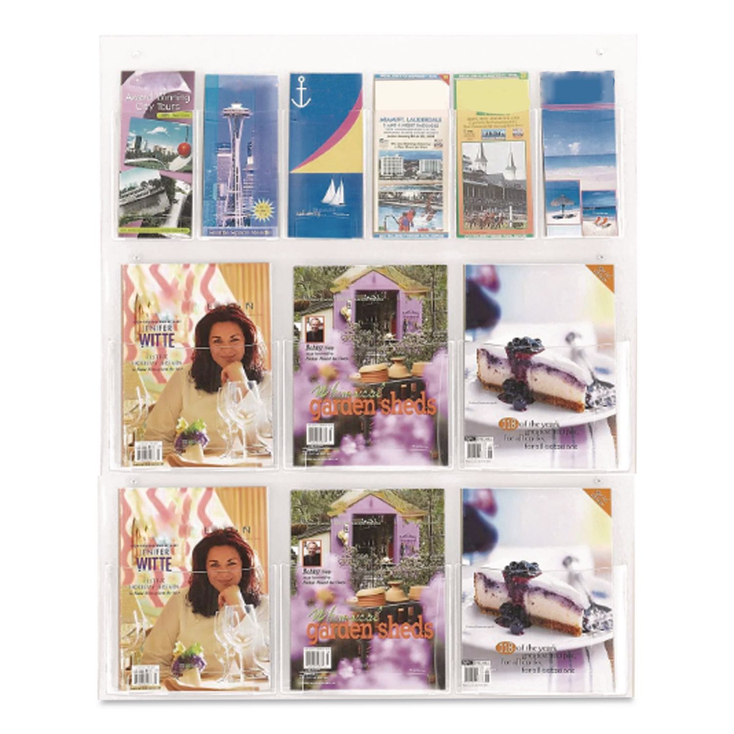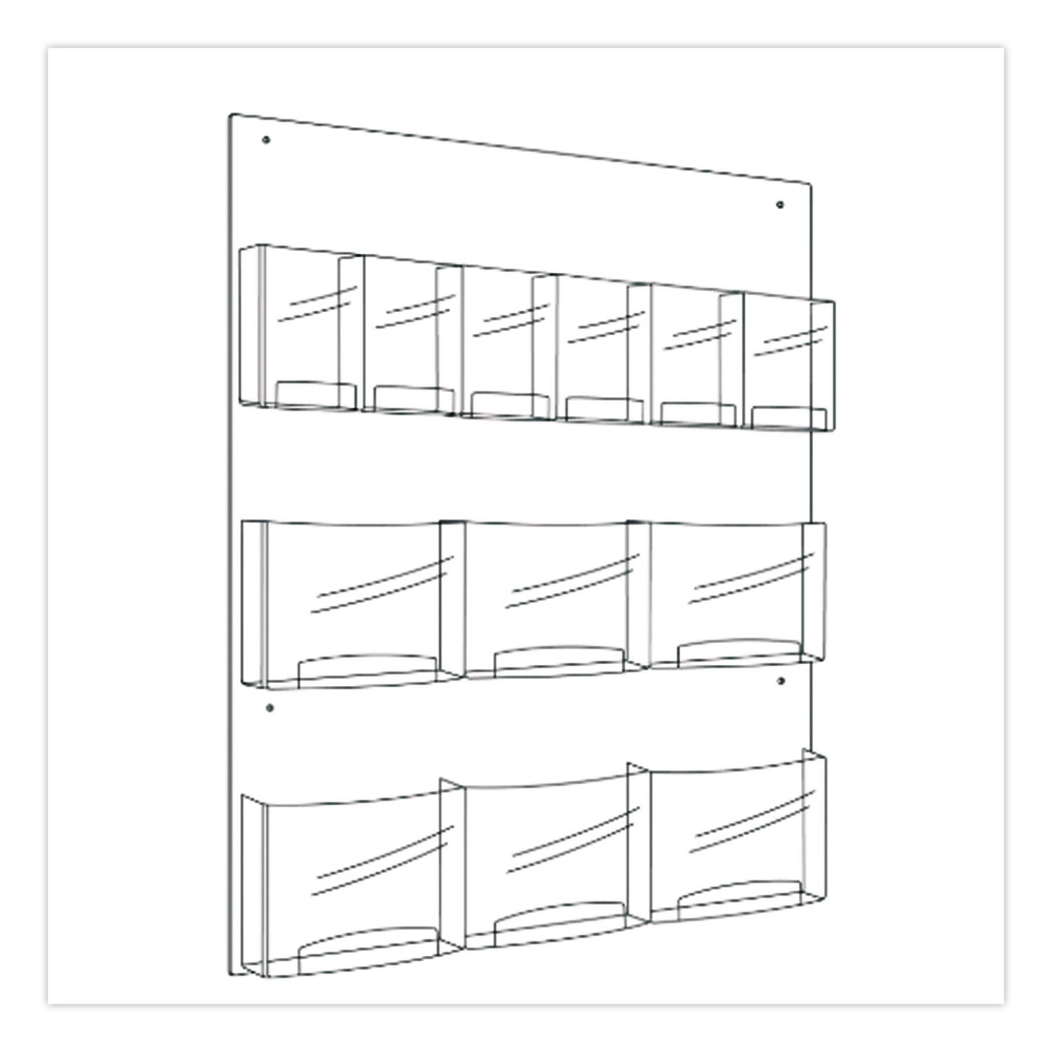 The Clear2c™ Magazine and Pamphlet Display is a clear, break-resistant polycarbonate pocketed literature display that holds up to six magazines and six pamphlet displays. Each pocket holds 2″ of printed material. The literature rack is pre-assembled with pre-drilled holes and includes screws and anchors. Color(s): Clear; Color Family: Clear; Overall Width: 29″; Overall Depth: 3″.