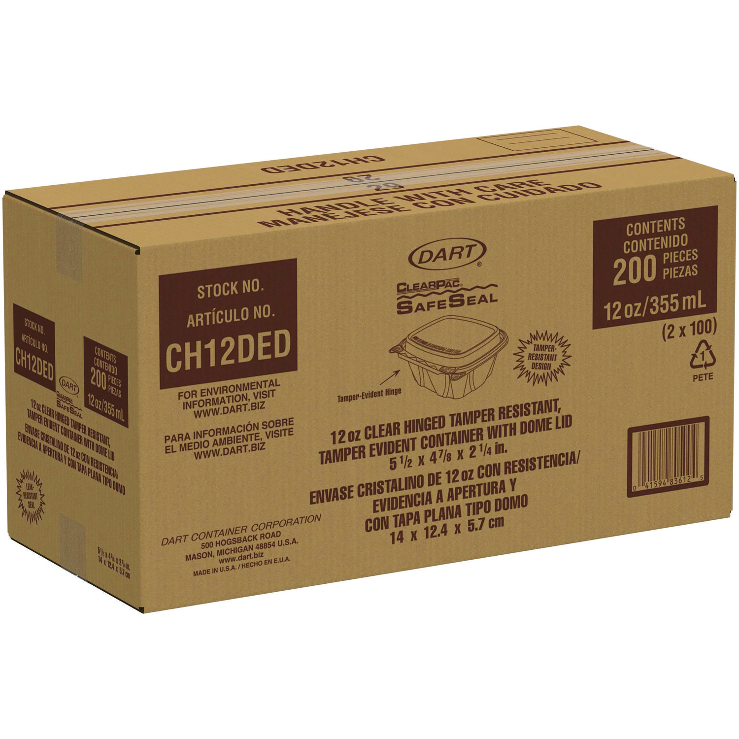 No matter what’s inside, these containers keep your food safe, secure and looking good! Designed to prevent tampering without shrink bands or extra wrapping, our containers make sharing food easy. Keep contents fresh and prevent leaks with the secure perimeter seal. The tamper alert hinge has a visible seal that, if broken, makes it obvious the container has been opened. The specialty lid inhibits the ability to lift it from the base without tearing the hinge. Once the seal is broken, the now two-piece container is easy to re-close and continues to be leak-resistant. Make sure your food is the star of the show thanks to the crystal-clear material. Merchandising and delivery is a breeze the sturdy stackable design. They’re even great for at-home use. Transport salads, fruits, or desserts to your next picnic, potluck, or bake sale. Domed lid. Food Container Type: Hinged Lid Container; Material(s): PET – Polyethylene Terephthalate; Material Type: Plastic; Interior Volume Capacity: 12 oz.