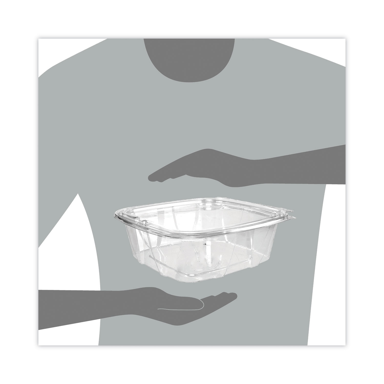 No matter what’s inside, these containers keep your food safe, secure and looking good! Designed to prevent tampering without shrink bands or extra wrapping, our containers make sharing food easy. Keep contents fresh and prevent leaks with the secure perimeter seal. The tamper alert hinge has a visible seal that, if broken, makes it obvious the container has been opened. The specialty lid inhibits the ability to lift it from the base without tearing the hinge. Once the seal is broken, the now two-piece container is easy to re-close and continues to be leak-resistant. Make sure your food is the star of the show thanks to the crystal-clear material. Merchandising and delivery is a breeze the sturdy stackable design. They’re even great for at-home use. Transport salads, fruits, or desserts to your next picnic, potluck, or bake sale. Flat lid. Food Container Type: Hinged Lid Container; Material(s): PET – Polyethylene Terephthalate; Material Type: Plastic; Interior Volume Capacity: 48 oz.