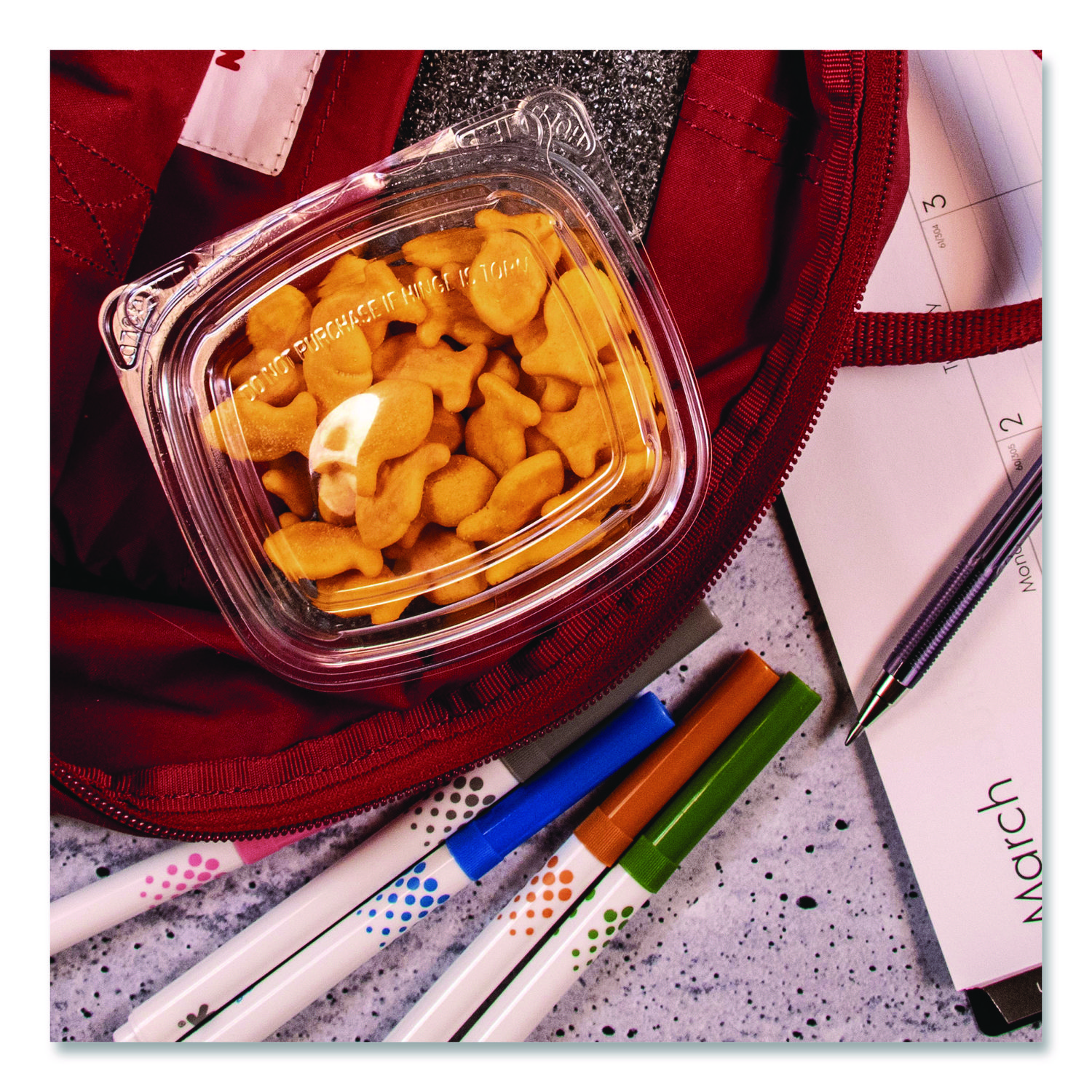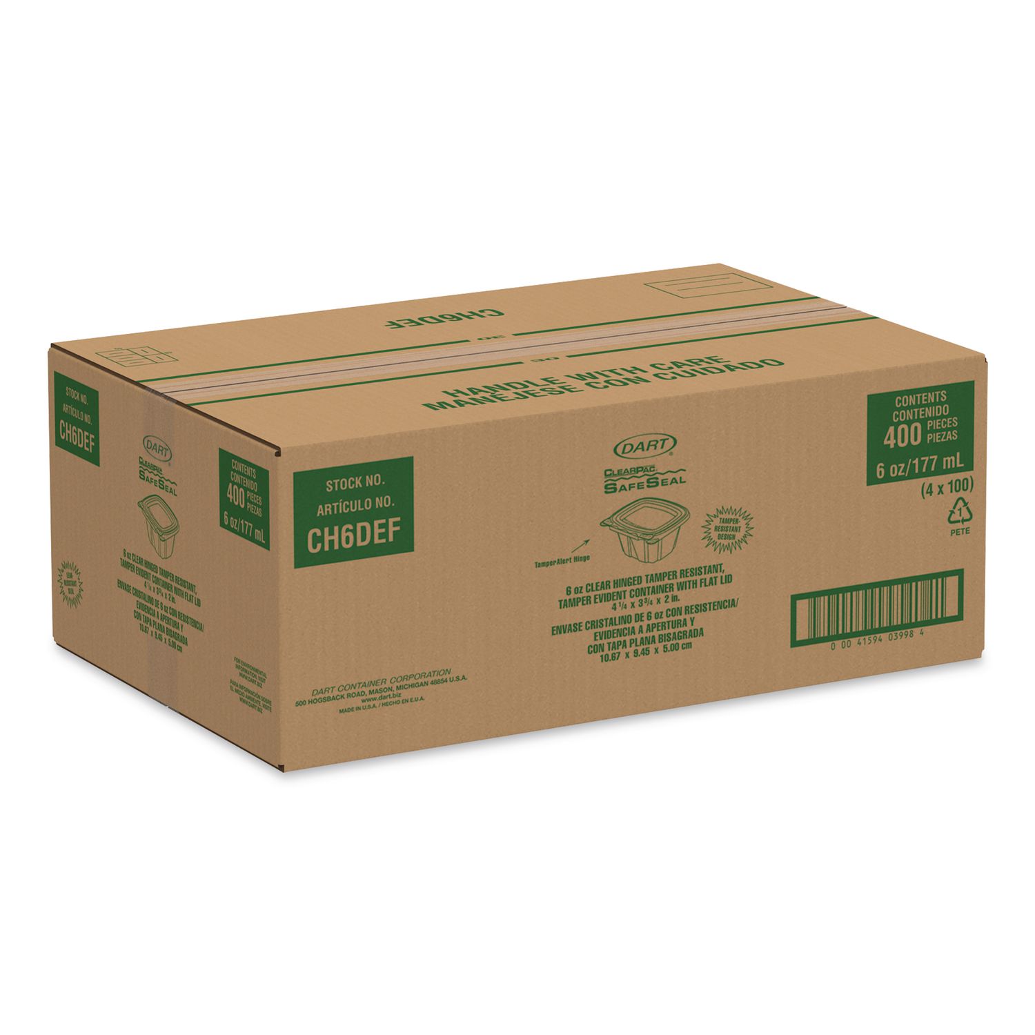 No matter what’s inside, these containers keep your food safe, secure and looking good! Designed to prevent tampering without shrink bands or extra wrapping, our containers make sharing food easy. Keep contents fresh and prevent leaks with the secure perimeter seal. The tamper alert hinge has a visible seal that, if broken, makes it obvious the container has been opened. The specialty lid inhibits the ability to lift it from the base without tearing the hinge. Once the seal is broken, the now two-piece container is easy to re-close and continues to be leak-resistant. Make sure your food is the star of the show thanks to the crystal-clear material. Merchandising and delivery is a breeze the sturdy stackable design. They’re even great for at-home use. Transport salads, fruits, or desserts to your next picnic, potluck, or bake sale. Food Container Type: Hinged Lid Container; Material(s): PET – Polyethylene Terephthalate; Material Type: Plastic; Interior Volume Capacity: 6 oz.