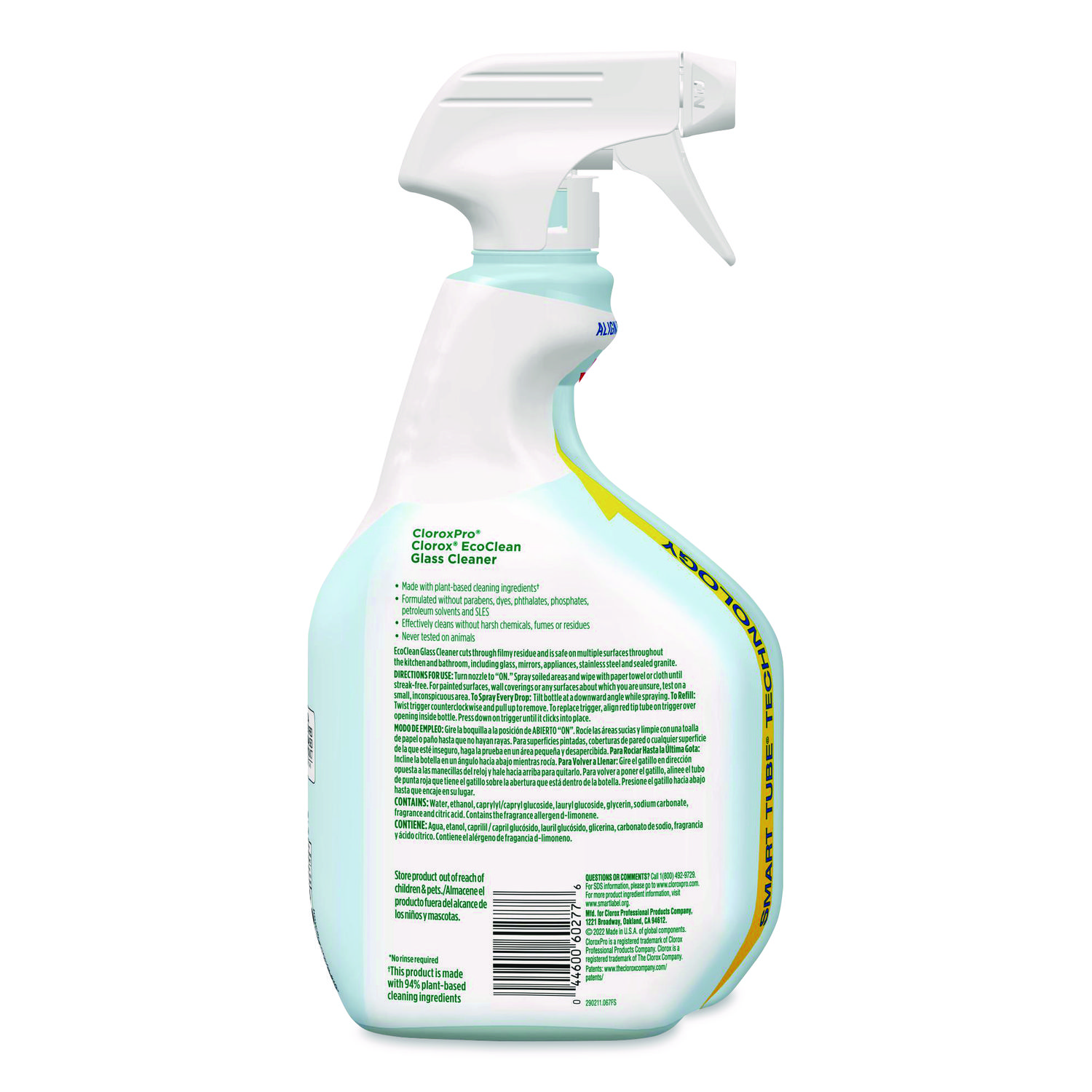 Clorox® Clorox Pro® EcoClean™ Glass Cleaner cuts through filmy residue and is safe on multiple surfaces throughout the kitchen and bathroom, including glass, mirrors, appliances, stainless steel and sealed granite. This streak free glass cleaning spray meets US EPA Safer Choice Product standards and is a USDA Certified Biobased cleaner made with 94% biobased cleaning ingredients. This glass cleaning spray is formulated without ammonia, parabens, dyes, phthalates, phosphates, petroleum solvents and SLES. Great for commercial use, Clorox® Clorox Pro® EcoClean™ Glass Cleaner effectively cleans without harsh chemical odors, fumes or residues and is safe for use around food contact surfaces without rinsing. With SmartTube® technology, you can spray every drop and get the most out of the bottle. Application: Glass; Applicable Material: Glass; Chemical Compound: Water; Ethanol; Caprylyl/Capryl Glucoside; Lauryl Glucoside; Glycerin; Sodium Carbonate; Citric Acid; Dirt Types: Dust; Fingerprints; Smudges.