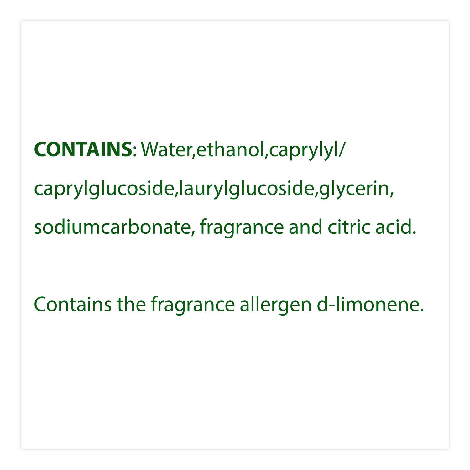| Chemical Compound: | Water; Ethanol; Caprylyl/Capryl Glucoside; Lauryl Glucoside; Glycerin; Sodium Carbonate; Citric Acid |