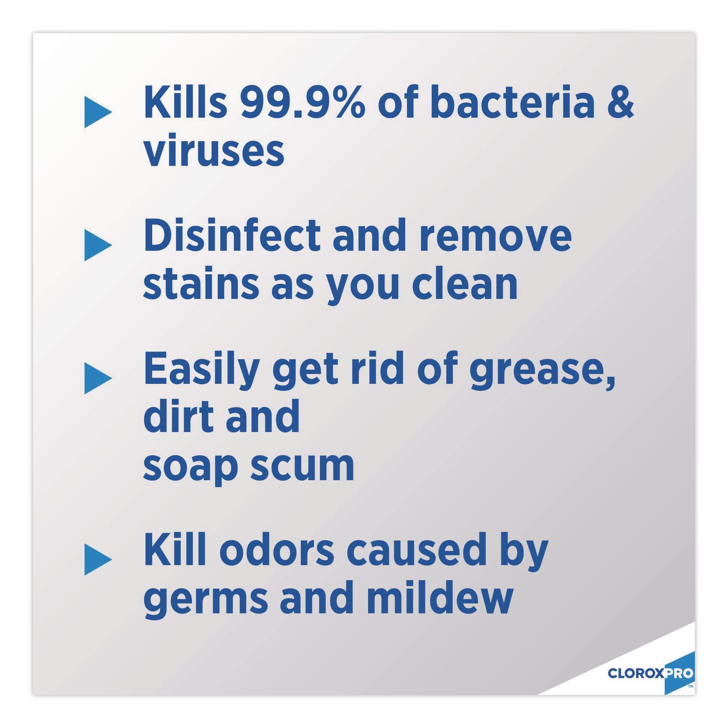 Clorox® CloroxPro® Clean-Up Disinfectant Cleaner with Bleach is a powerful one-step cleaner that you can remove stains, clean and disinfect confidently with the power of Clorox® Bleach. It eliminates odors caused by bacteria, mold and mildew. This disinfectant cleaner with bleach meets EPA criteria for use against SARS-CoV-2, the virus that causes COVID-19 on hard nonporous surfaces when used as directed. From CloroxPro®, this fresh smelling spray cleaner is perfect for use in offices, day care centers, restaurants, schools and other commercial facilities. Spray every drop with Smart Tube® technology that reaches to the very bottom of the bottle. Packaging may vary. Value Pack-Stock up and save! Application: Disinfectant/Cleaner; Applicable Material: Ceramics; Cement/Concrete; Enamel; Fiberglass; Glass; Grout; Laminates; Metal; Plastic; Sealed/Engineered Stone; Vinyl; Dirt Types: Bacteria; Body Fluids; Dust; Germs; Grease; Oil; Organic Matter; Viruses; Water-Based Soil; Physical Form: Liquid.