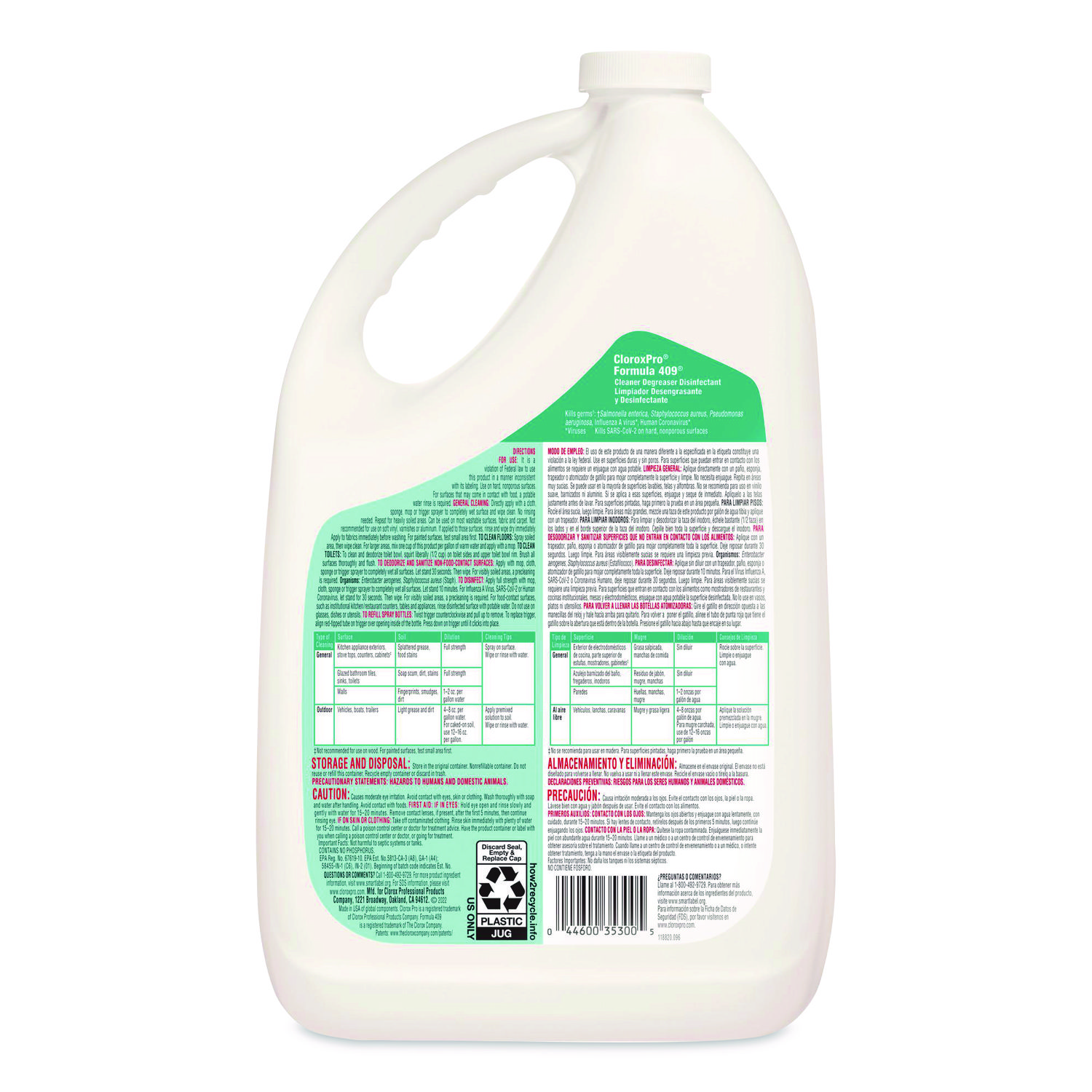 Formula 409® Cleaner Degreaser Disinfectant cuts through grease, grime and food stains while killing 99.9% of germs on hard nonporous surfaces. As an EPA-registered disinfectant and sanitizer, this versatile cleaner is formulated to kill Salmonella, Staph, E. Coli, and athlete’s foot fungus on non-food-contact surfaces. It also contains no bleach, making it suitable for a variety of surfaces like countertops, stovetops and stainless steel appliances. From CloroxPro®, this degreaser and disinfectant powers through tough messes and is perfect for use in commercial kitchens, schools and office break rooms. Trusted by professionals for more than a century, CloroxPro® is dedicated to providing proven commercial cleaning and disinfecting solutions. Application: Degreaser/Cleaner; Applicable Material: Ceramic; Fiberglass; Glass; Laminates; Metal; Plastic; Dirt Types: Bacteria; Grease; Grime; HIV-1; Oil; Smoke Film; Soil; Viruses; Physical Form: Liquid.