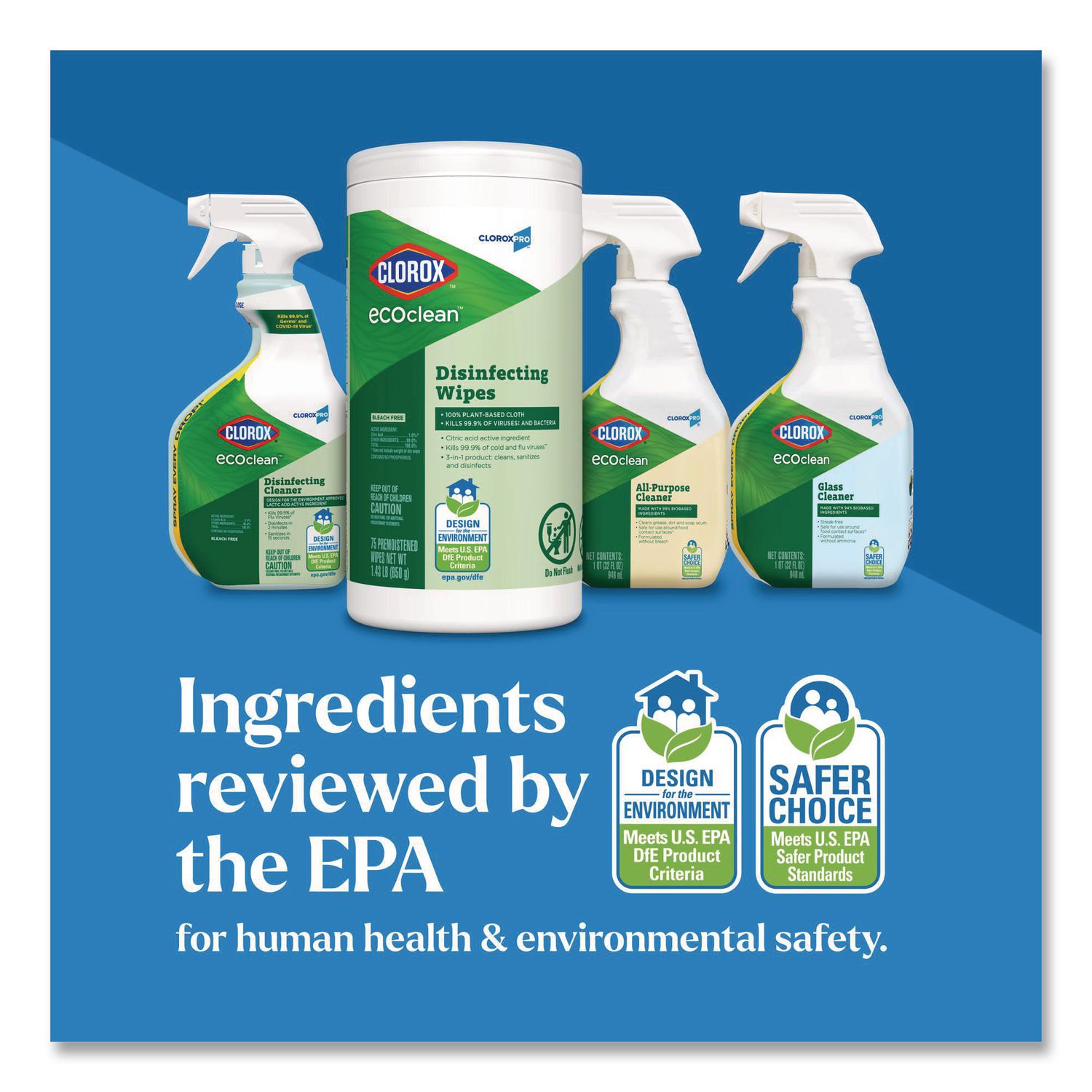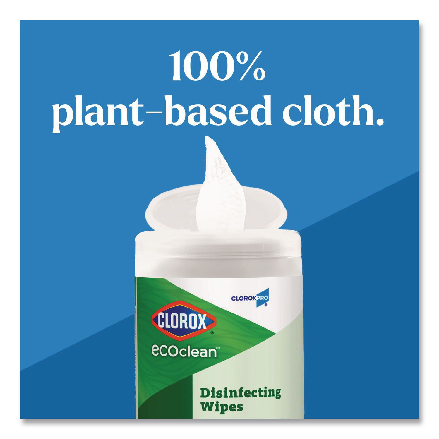 Clorox® EcoClean™. A Clorox clean that’s powered by nature. These cleaning and disinfecting wipes are EPA Design for the Environment certified, have a 100% plant-based cloth and are made without bleach, ammonia, alcohol or dyes. They kill 99.9% of germs with a citric acid active ingredient that disinfects, sanitizes, cleans and removes allergens including pet dander, cockroach matter, pollen particles, dust mite particles from high touch surfaces without the need for gloves, goggles or personal protective equipment (PPE) when used as directed. Use them to quickly clean and disinfect kitchen counters, sinks, light switches, door handles, desks and chairs in commercial facilities like schools, colleges, offices, restrooms and hotels. Part of the Clorox® EcoClean™ line of EPA Safer Choice and DFE certified products, EcoClean™ Disinfecting Wipes deliver a clean you can count on. 100% plant-based active ingredient and substrate. Towel/Wipe Type: Cleaning/Disinfecting Wipes; Applicable Material: Laminate; Sealed Hardwood; Tile; Vinyl; Material(s): Nonwoven Fiber; Chemical Compound: Citric Acid.