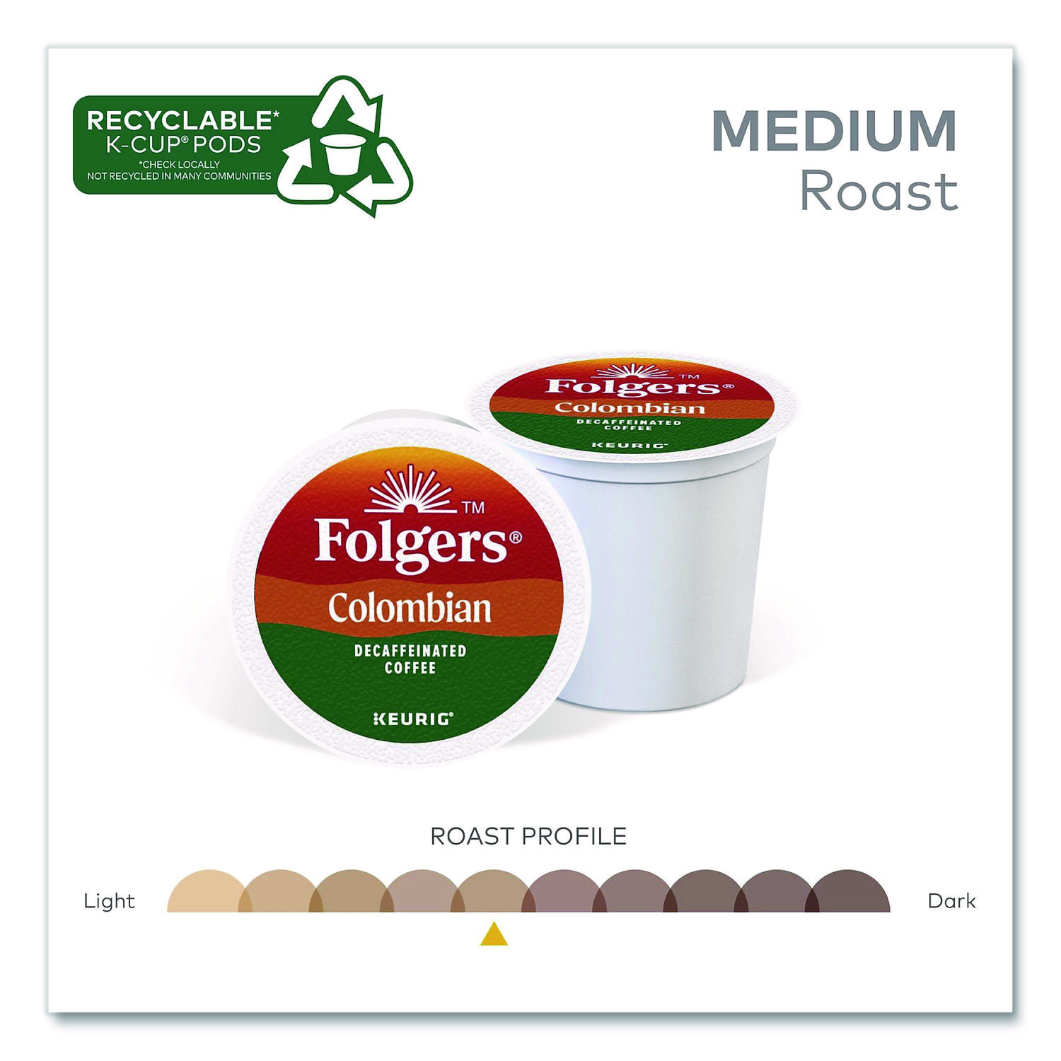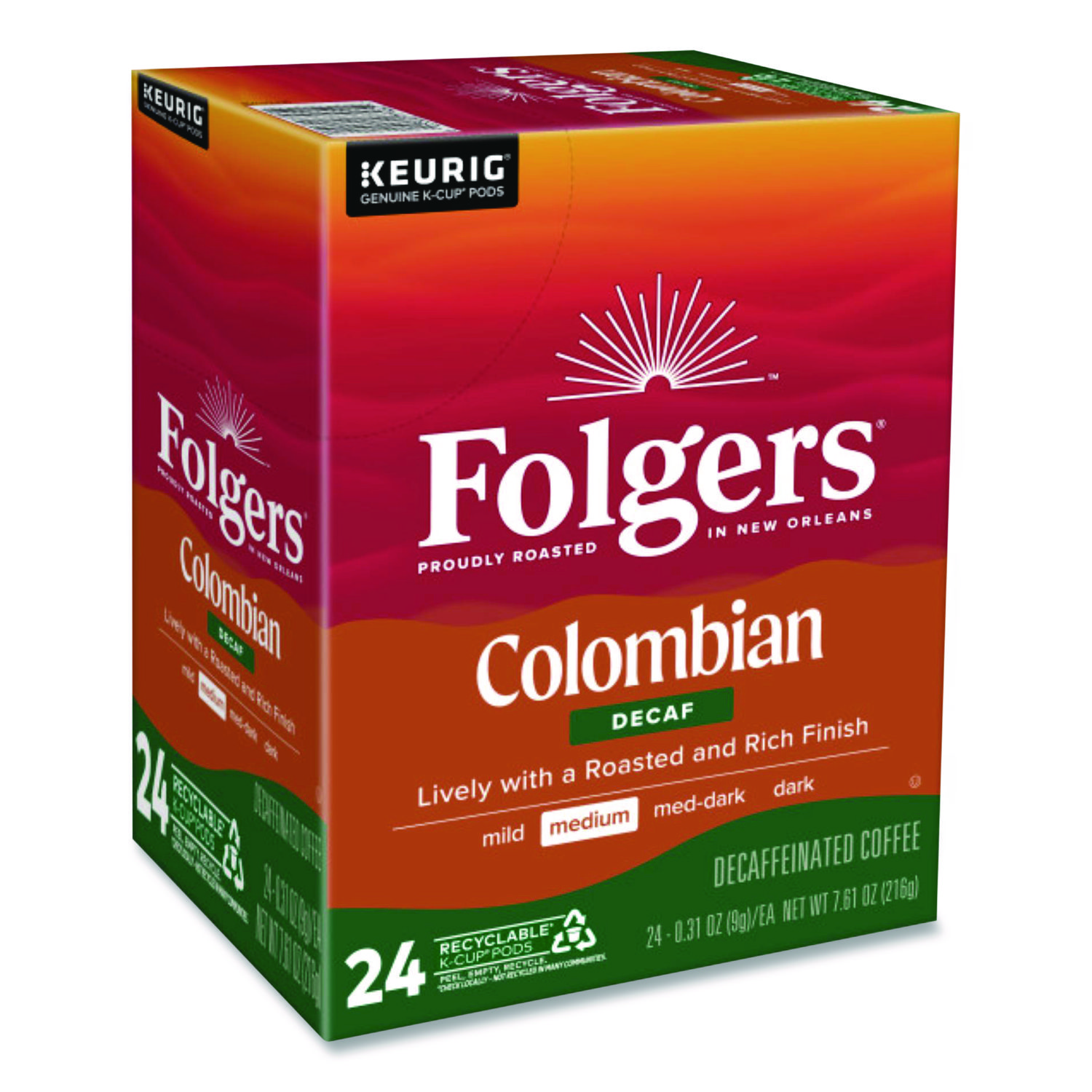 The distinctively rich and full-bodied taste of Colombian beans, except it’s decaffeinated. Enjoy the trusted taste of Folgers®. Spend more time enjoying your favorite cup of Folgers coffee with our Keurig® K-Cup® pods. Rich, pure flavor and classic aroma you love, conveniently brewed with the touch of a button. It’s the perfect way to start your day. Beverage Type: Decaffeinated Coffee; Flavor: Colombian Decaf; Roast Type: Medium; Product Packaging: K-Cup®.