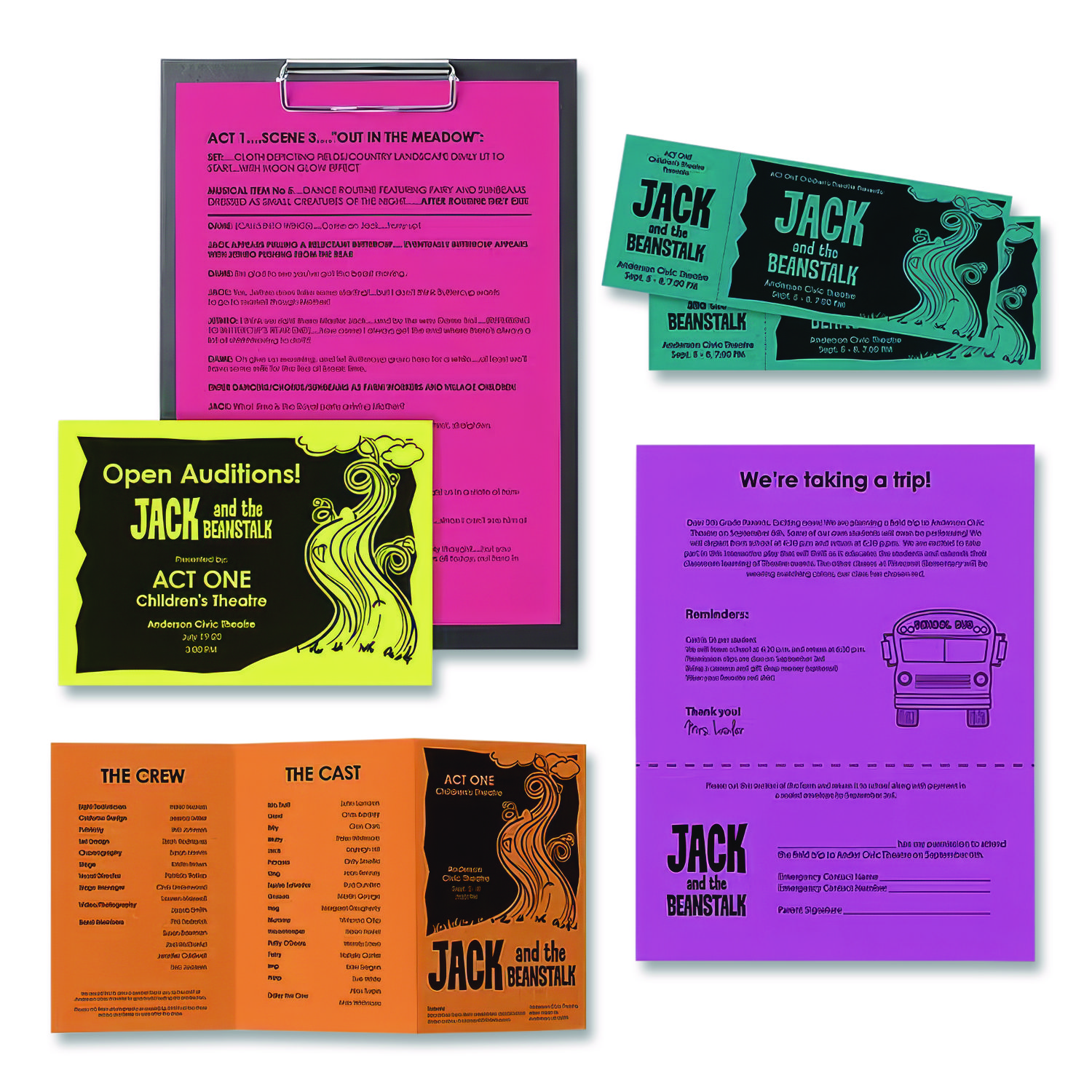 When you need to stand out with high-impact colors, Astrobrights® Colored Paper is a great choice. It’s 20% thicker and more substantial than ordinary printer paper, so you can achieve great results for one- and two-sided documents. Plus, because the colored copy paper creates a vibrant background, you’ll save on pricey full-color ink printing. Easily create vibrant fliers, brochures, school projects, signs, coupons, posters and paper crafts. Brighter colors. Brighter ideas. Can’t decide on just one high-impact color? With the Astrobrights® “Tropical” Assortment you don’t have to. In each pack, you’ll get five separate, solid colors. Get ready for your most creative ideas to really take off! Sheet/Roll Size: 8.5 x 11; Paper Basis Weight (lb): 24 lb Bond; Paper Grade (gsm): 89 gsm; Paper/Media Color(s): Assorted Tropical Colors.