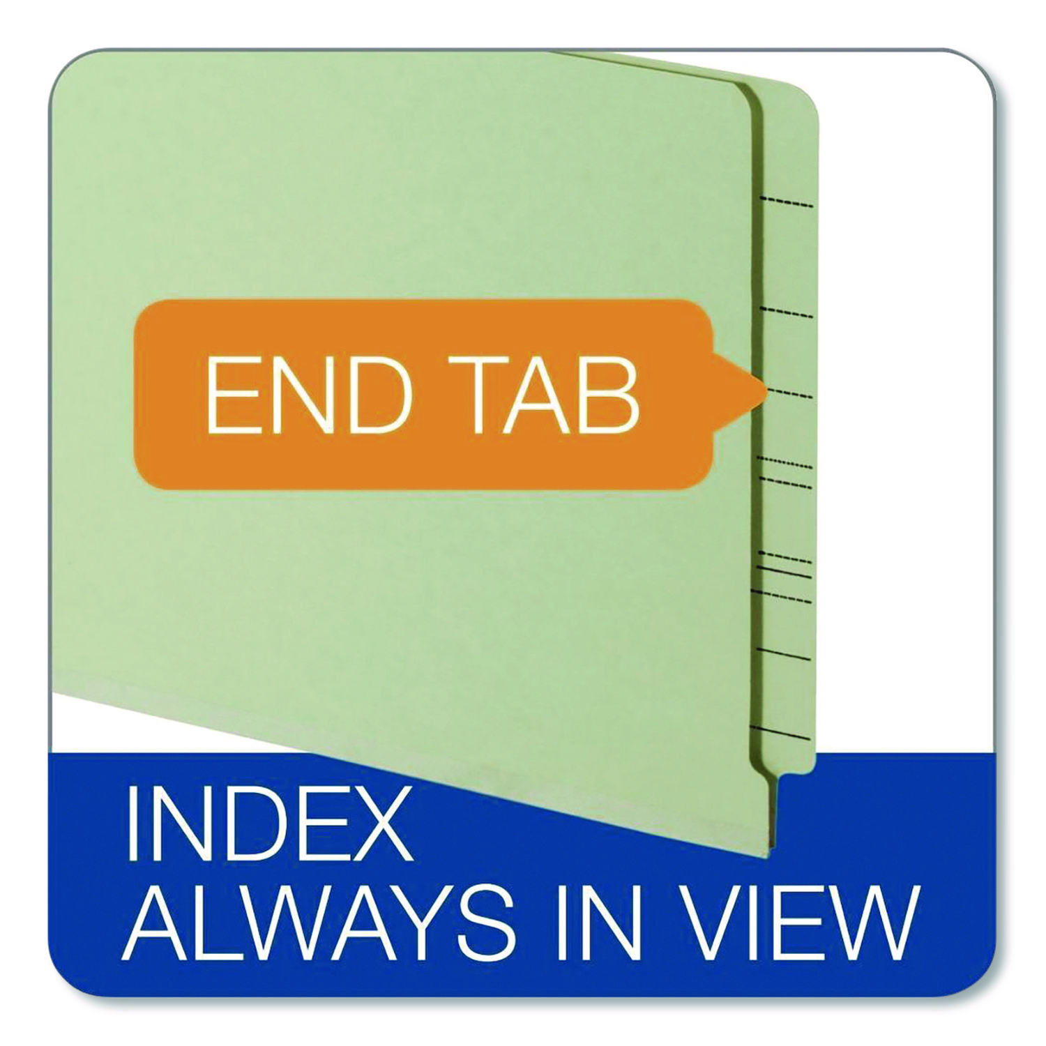 Bring color-coding efficiency to your filing tasks! Pendaflex® Colored Pressboard End Tab Fastener Folders help you get more from your shelf filing system. Undercut front covers and embossed end tabs simplify labeling while making file identification easy, and the folders’ distinctive exterior colors enable color-coding by category to further streamline file management while improving file-retrieval times. Super-strong pressboard construction and embedded fasteners ensure your important documents remain safely contained, and the folders’ expansion gussets are also reinforced with rip-proof tape to deliver reliable, long-lasting performance for even your thickest files. Folder Size: Legal; Total Number of Fasteners: 2; Cover Tab Style: End Tab; Cover Tab Cut: Straight.