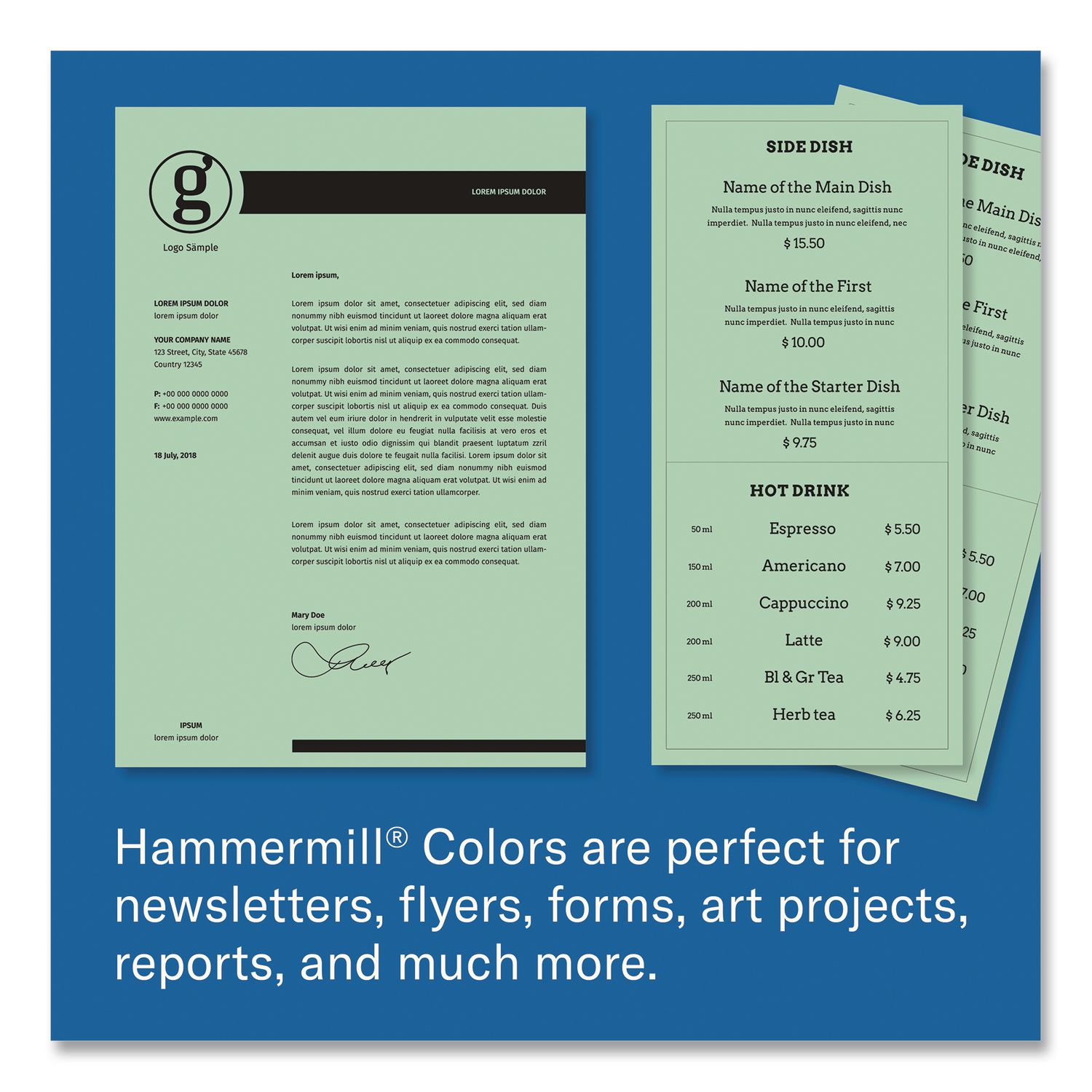 Increase the visual appeal of your documents. High-quality Hammermill® Colors Print Paper is available in an array of beautiful pastel colors to help your documents stand out from the crowd. Backed by the 99.99% JAM-FREE® Guarantee, its precise, accurate sheeting, consistent moisture content, reliable curl-control treatment and smooth, even surface all work together to deliver trouble-free performance in all compatible machines. High-opacity also ensures minimal show-through. Excellent for color-coding and perfect for forms, reports, price sheets, bulletins and more, Hammermill® Colors is designed to fulfill all of your color-paper printing needs. Manufactured acid-free for archival-quality longevity. Sheet/Roll Size: 8.5 x 11; Paper Basis Weight (lb): 24 lb Bond; Paper Grade (gsm): 90 gsm; Paper/Media Color(s): Green.