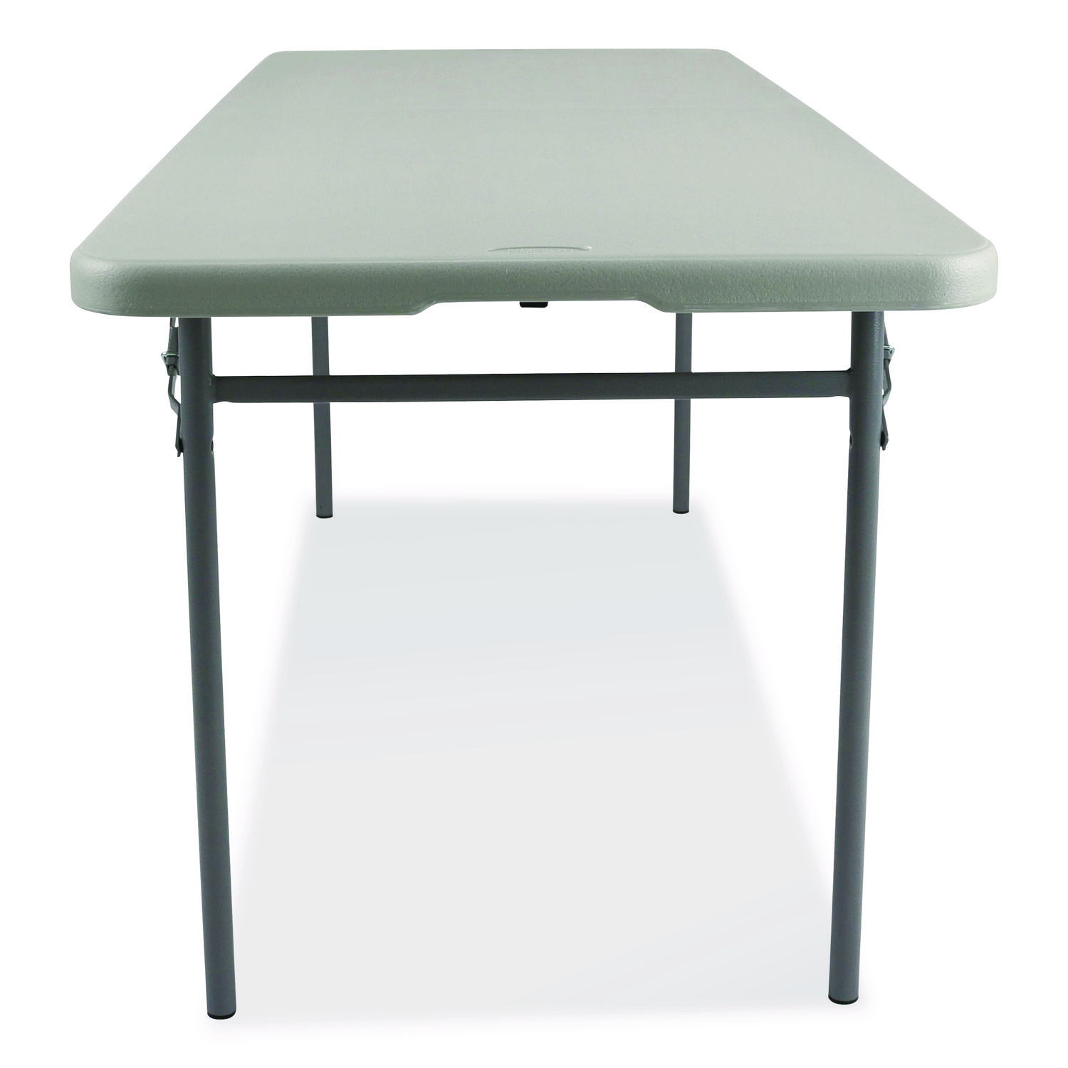 Discover the pinnacle of industrial-strength, foldable tables designed for demanding environments. Merges unparalleled durability with a robust, unobstructed design, making it the ideal choice for heavy-duty applications both indoors and outdoors. Crafted from high-density blow-molded plastic, this table is scratch-resistant, ensuring it withstands the rigors of daily use. The unique leg design, placed near the ends of the table, eliminates traditional wishbone legs that obstruct seating, allowing for extra seating capacity and comfort at both ends. This versatile table provides ample space for various activities, making it perfect for meetings, training sessions, community events or gatherings. The steel legs and the 1.75″ thick blow-molded top, supported by an industrial-grade 18-gauge frame, ensure that the table remains stable on any surface. Non-slip covers on the legs protect both the table and the floor, enhancing safety and preventing damage. Best of all, its design allows for quick and easy setup—no assembly required. Simply unfold the table in seconds for immediate use, making it an ideal solution for both indoor and outdoor activities. Top Color: Speckled Gray; Color Family: Gray; Base Color: Gray; Top Shape: Rectangular.