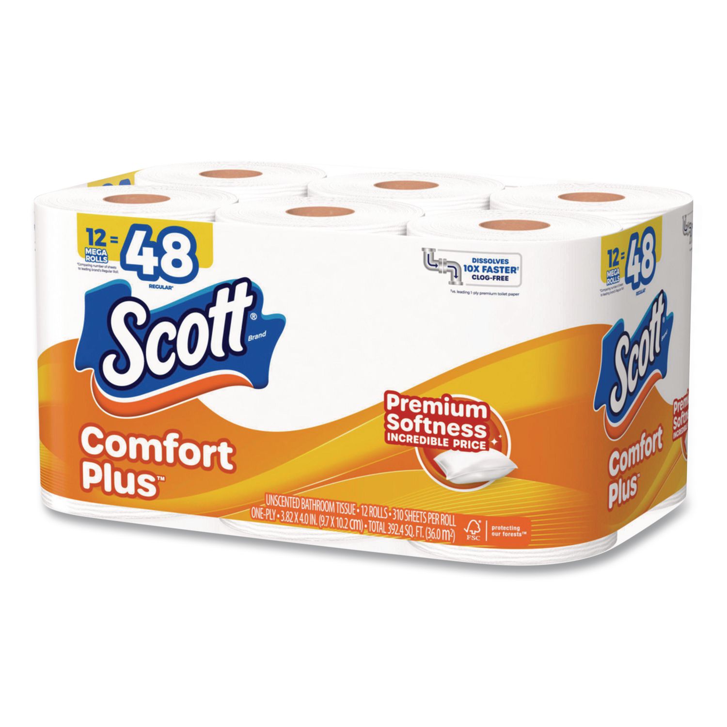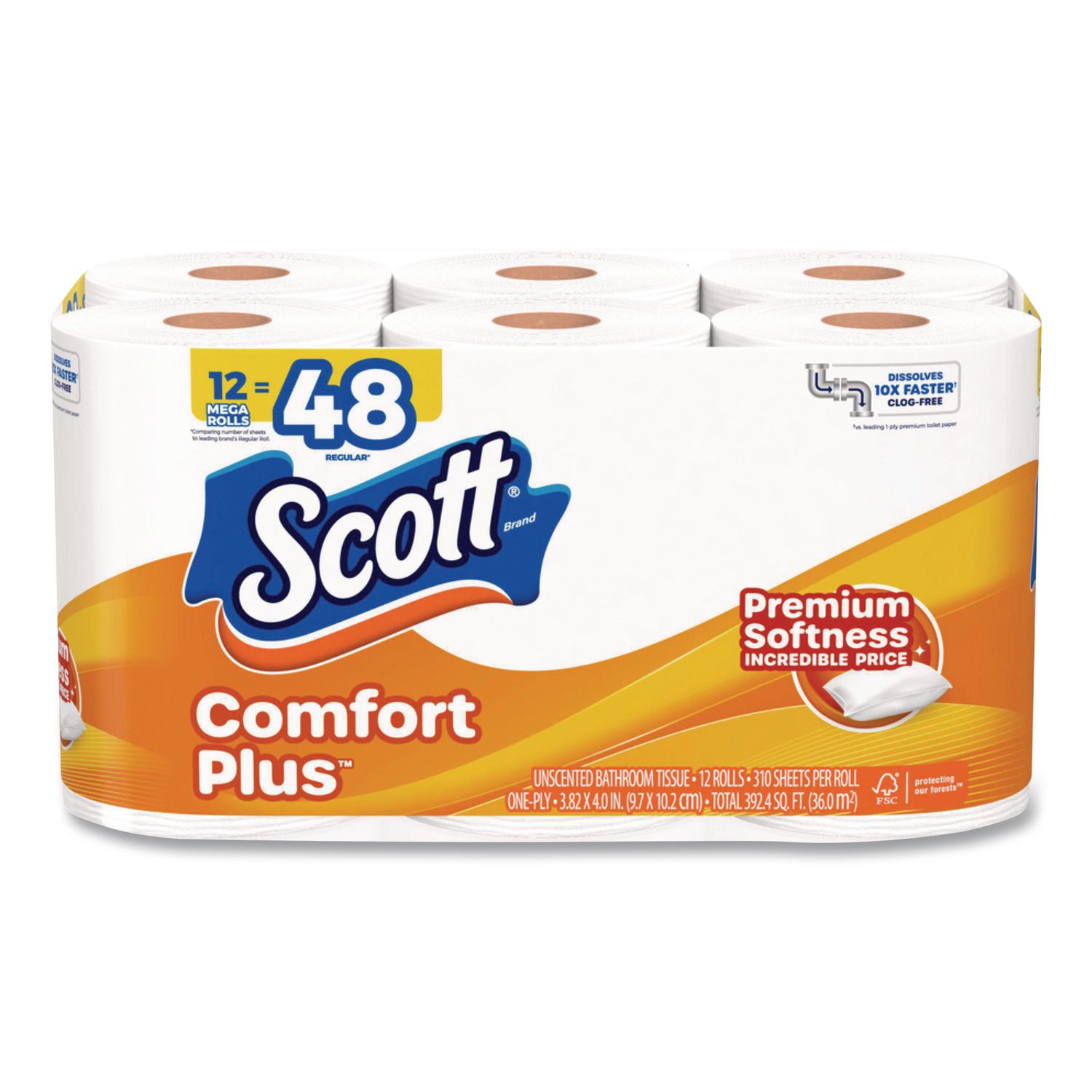 A one-layer bath tissue that offers everyday comfort plus a little extra. ScottĀ® ComfortPlus is sewer-safe and septic-safe and designed with strength and comfort in mind. It combines just the right amount of softness and strength by providing thick and plush sheets, for a trusted, comforting clean. Tissue Type: Toilet; Number of Plies: 1; Number of Sheets: 310; Width: 3.82″.
