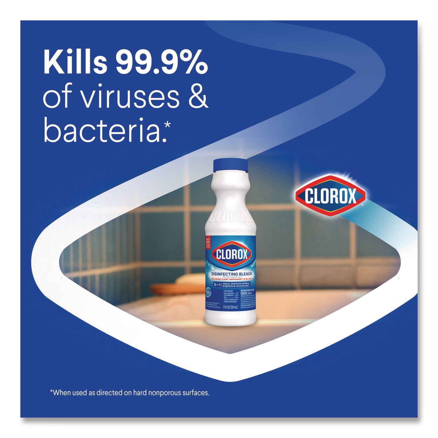 Get a far reaching clean with America’s #1 bleach. Clorox® Disinfecting Bleach with CloroMax kills 99.9% of household germs and bacteria including norovirus, flu virus, MRSA, E. coli and Salmonella left on household surfaces such as countertops, floors, toilets and more, when used as directed. This versatile product gives you 5 benefits in 1: it cleans, disinfects hard nonporous surfaces, whitens, brightens and removes odors, giving you the confidence of a lasting clean. Formulated with CloroMax Technology, this concentrated bleach protects surfaces in your business as it cleans, so stains won’t stick and cleanup is easier. It also whitens whites and keeps clothes whiter longer, while removing stains even in cold water. Application: Bleach; Applicable Material: Ceramics; Cement/Concrete; Enamel; Fabric; Glass; Laminate; Metal; Plastic; Chemical Compound: Sodium Hypochlorite; Dirt Types: Bacteria; Fungus; Germs; Grime; Mildew; Mold; Organic Matter; Soil; Stains.
