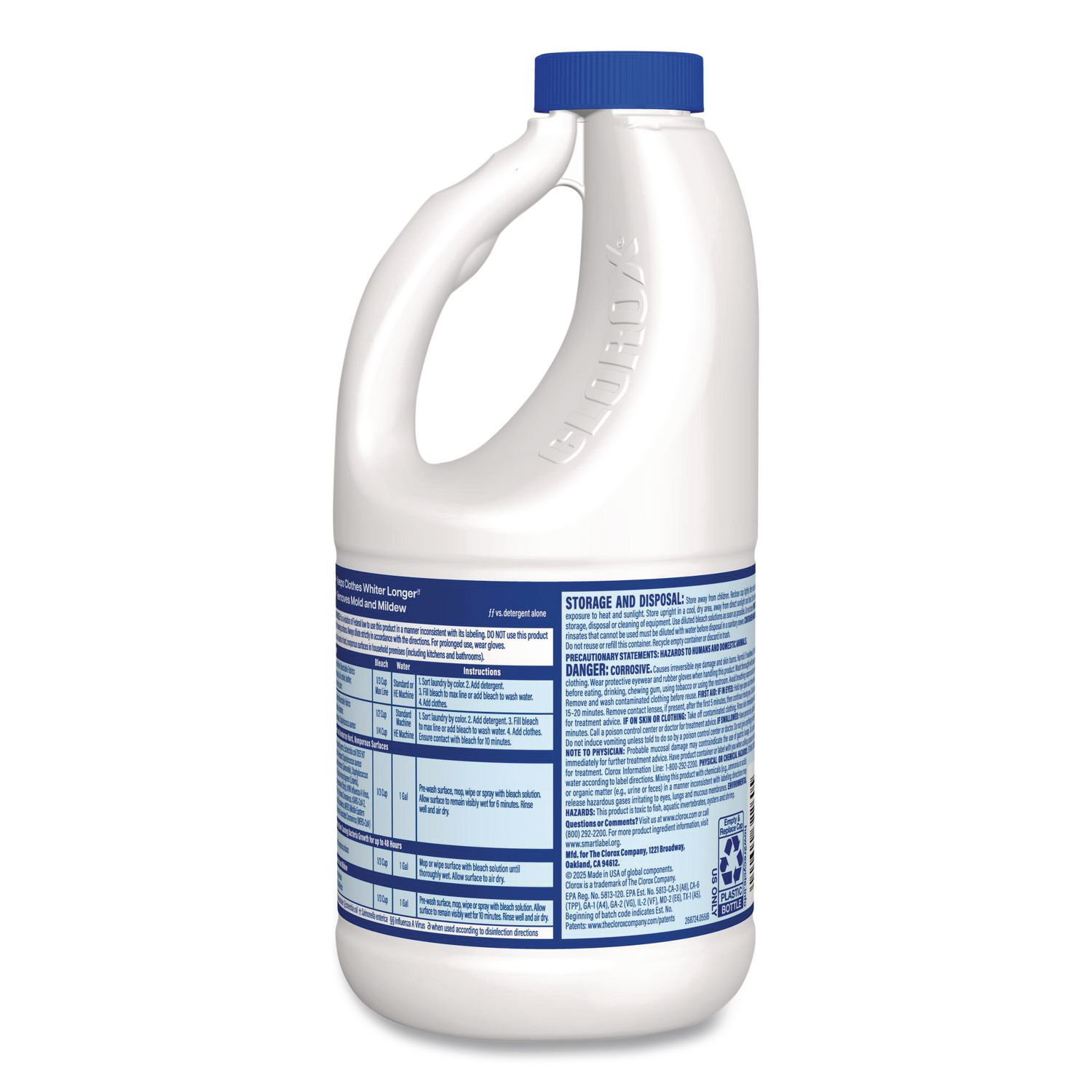 Get a far reaching clean with America’s #1 bleach. Clorox® Disinfecting Bleach with CloroMax kills 99.9% of household germs and bacteria including norovirus, flu virus, MRSA, E. coli and Salmonella left on household surfaces such as countertops, floors, toilets and more, when used as directed. This versatile product gives you 5 benefits in 1: it cleans, disinfects hard nonporous surfaces, whitens, brightens and removes odors, giving you the confidence of a lasting clean. Formulated with CloroMax Technology, this concentrated bleach protects surfaces in your business as it cleans, so stains won’t stick and cleanup is easier. It also whitens whites and keeps clothes whiter longer, while removing stains even in cold water. Application: Bleach; Applicable Material: Ceramics; Cement/Concrete; Enamel; Fabric; Glass; Laminate; Metal; Plastic; Chemical Compound: Sodium Hypochlorite; Sodium Hydroxide; Dirt Types: Bacteria; Fungus; Germs; Grime; Mildew; Mold; Organic Matter; Soil; Stains.