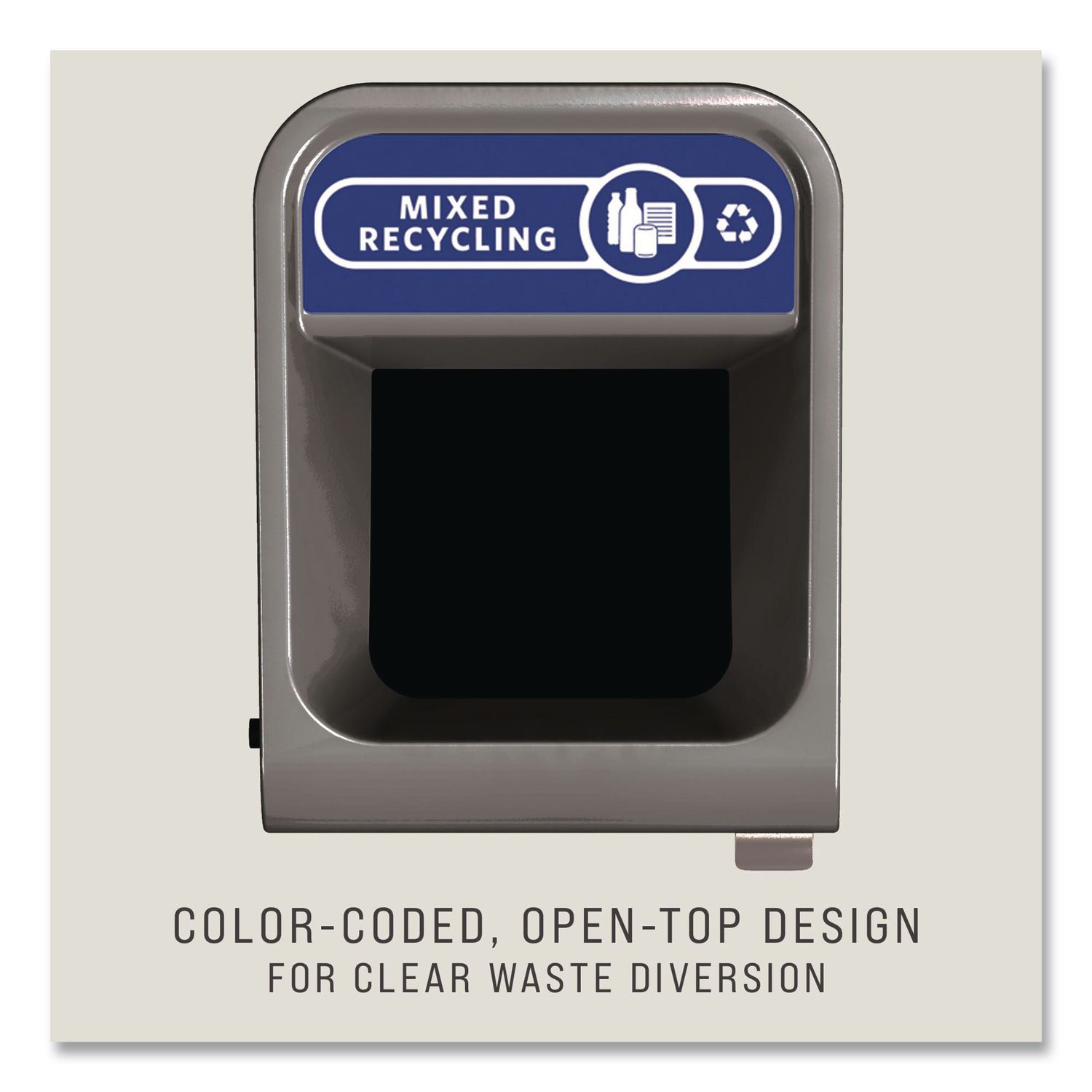 Provides a customizable recycling solution with sleek, smooth surfaces and contoured edges. Modern appearance fits seamlessly into any indoor or outdoor commercial environment. Magnetic connection keeps the containers arranged in the order that best fits the space, in a row or an island. Easy-access front door and handle allow for ergonomic emptying of waste. Internal door hinge prevents unsightly wall damage and helps maintain a neat, clean appearance. Rigid plastic liner with handle has built-in venting channels that create airflow. Secure liner bags with integrated liner cinches, allowing for knot-free liner changes. Shipped fully assembled. Mixed Recycling. Waste Receptacle Type: Indoor Recycling Bin; Material(s): Metal; Application: Indoor Recycling; Interior Volume Capacity: 33 gal.