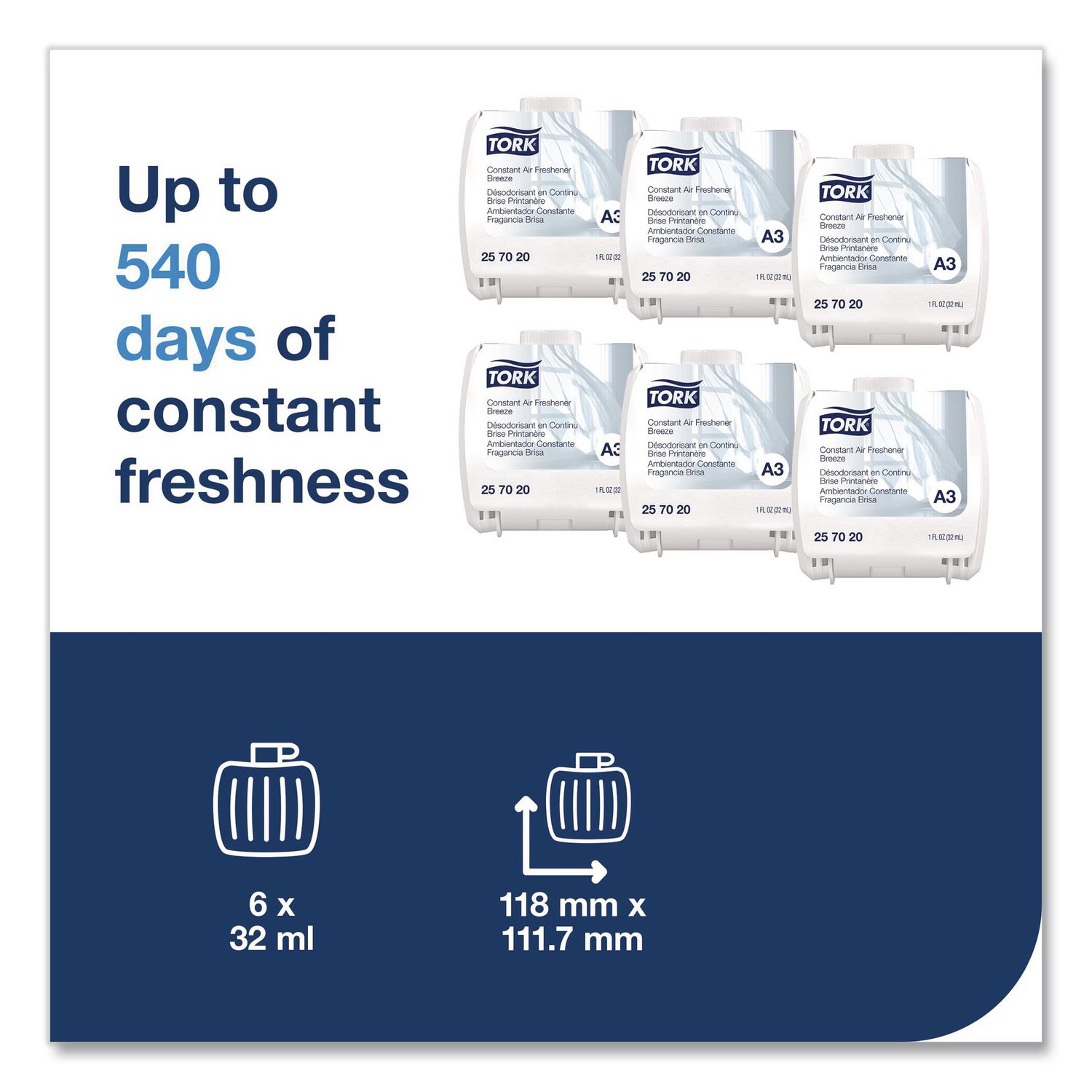 Tork® Constant Air Freshener Refills help to keep washrooms feeling welcoming and fresh. Suitable for Tork® Constant Air Freshener Dispensers, which are proven easy-to- use for cleaners.?. Odor Neutralizer—for facilities that require specific malodor eliminators. Physical Form: Oil; Application: Bathrooms; Volume Capacity: 32 mL; Product Packaging: Cartridge.