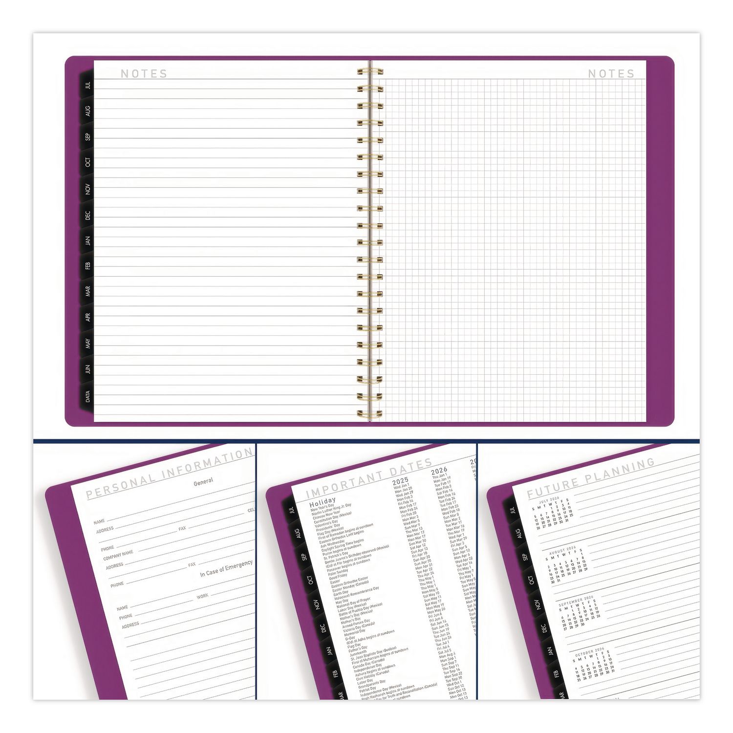 | Separate Sections: | (40) Notes Pages; Contacts Pages; Future Planning Pages; Important Dates; Meeting Notes; Three-Year Reference Calendar |