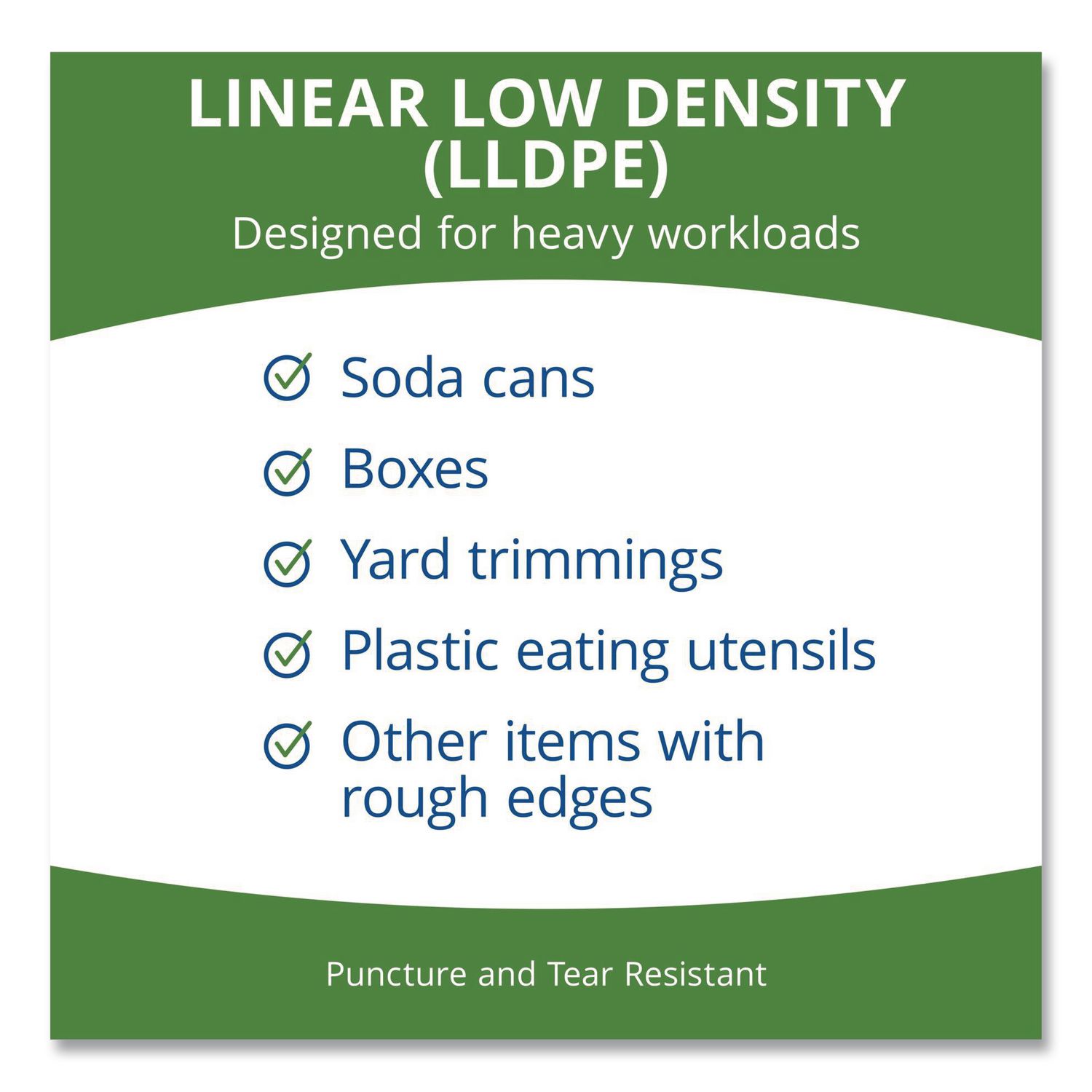 Controlled life-cycle plastics have similar performance properties of ordinary plastic bags except they are modified to accelerate aging in a process that safely returns the organic carbon, from which plastic is made, to the natural bio-cycle as a food source for microorganisms. Commercial/Consumer Use: Commercial Use; Maximum Volume Range: 11 to 15 gal; Maximum Volume Capacity: 13 gal; Waste Bag Thickness: 0.7 mil.