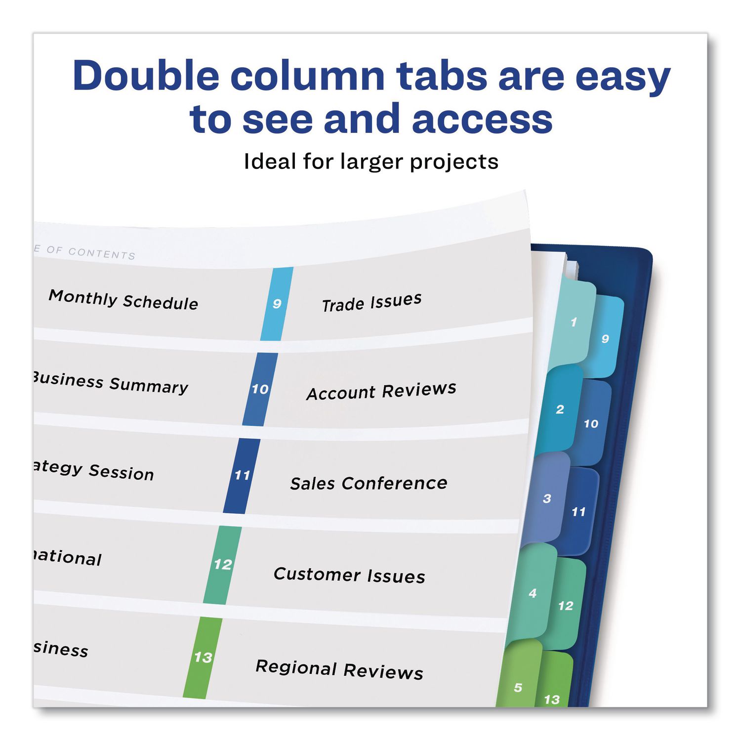 When you’ve got a big project, flex your organizational muscle with Double-Column Ready Index® Dividers. Designed to handle big projects easily and professionally, these multicolor tab dividers make it a snap to keep everything in order. The Table of Contents page features two columns so you have more space for your text, and it’s easy to customize using the free quick-fill templates from Avery Design & Print. You’ll get an innovative double-layer format that are easy to view and access. And because these dividers feature more durable paper, stronger tab reinforcement and double-sided hole reinforcement, you can rest assured they’ll stand up to frequent use. Get a big boost in organizational power with the Double-Column Ready Index Dividers. For laser and inkjet printers. Index Divider Style: Arabic Numeric; Index Divider Size: 11 x 8.5; Punched/Unpunched: 3-Hole Punched; For Use With: Ring Binders.