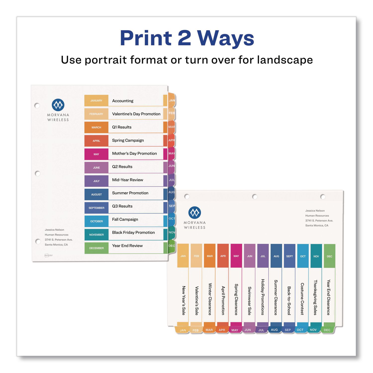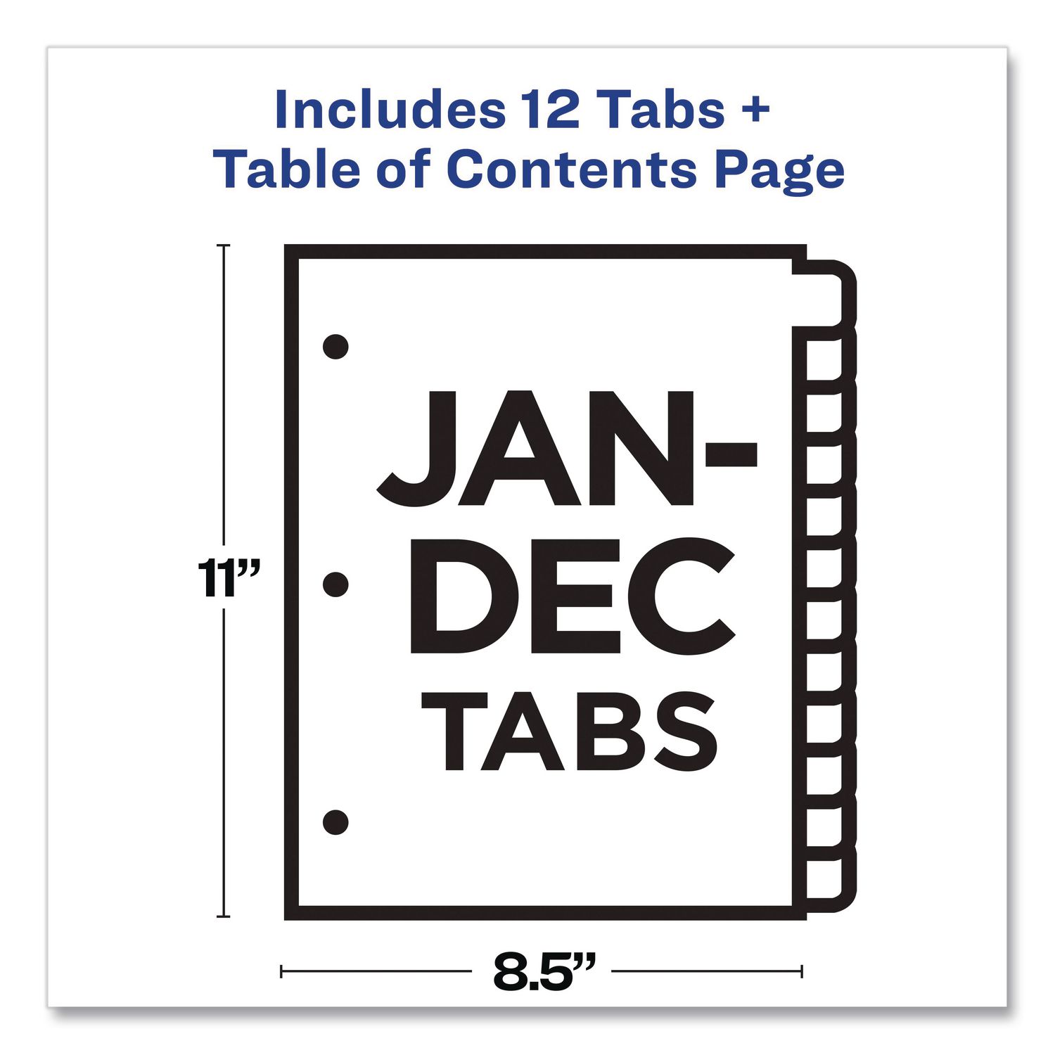 Organized documentation makes a business run like a well-oiled machine. These Ready Index Table of Contents Dividers help you stay organized so you can locate documents quickly and efficiently. They feature preprinted multicolor tabs that can be displayed in either landscape or portrait format. Using free templates from Avery Design & Print you can customize the included table of contents page and print in minutes. Organization and efficiency-makes life better for your business. For laser and inkjet printers. Traditional Colors. Index Divider Style: Monthly; Index Divider Size: 11 x 8.5; Punched/Unpunched: 3-Hole Punched; For Use With: Ring Binders.