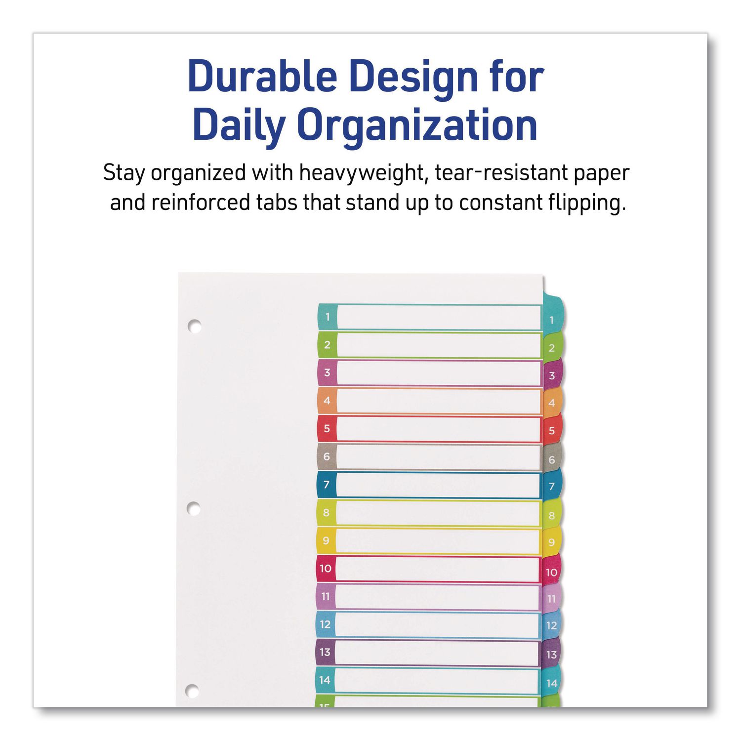 Organized documentation makes a business run like a well-oiled machine. These Ready Index Table of Contents Dividers help you stay organized so you can locate documents quickly and efficiently. They feature preprinted multicolor tabs that can be displayed in either landscape or portrait format. Using free templates from Avery Design & Print you can customize the included table of contents page and print in minutes. Organization and efficiency-makes life better for your business. For laser and inkjet printers. Contemporary Colors. Index Divider Style: Arabic Numeric; Index Divider Size: 11 x 8.5; Punched/Unpunched: 3-Hole Punched; For Use With: Ring Binders.