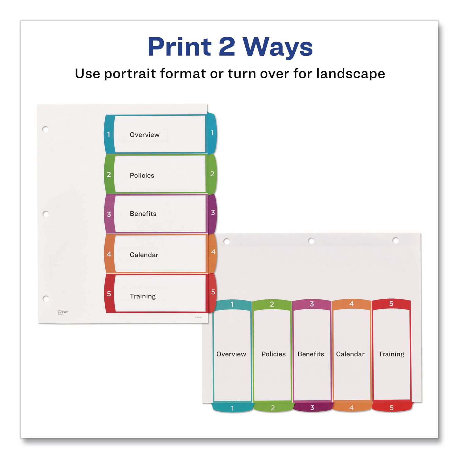 Organized documentation makes a business run like a well-oiled machine. These Ready Index Table of Contents Dividers help you stay organized so you can locate documents quickly and efficiently. They feature preprinted multicolor tabs that can be displayed in either landscape or portrait format. Using free templates from Avery Design & Print you can customize the included table of contents page and print in minutes. Organization and efficiency-makes life better for your business. For laser and inkjet printers. Contemporary Colors. Index Divider Style: Arabic Numeric; Index Divider Size: 11 x 8.5; Punched/Unpunched: 3-Hole Punched; For Use With: Ring Binders.